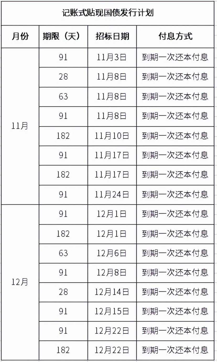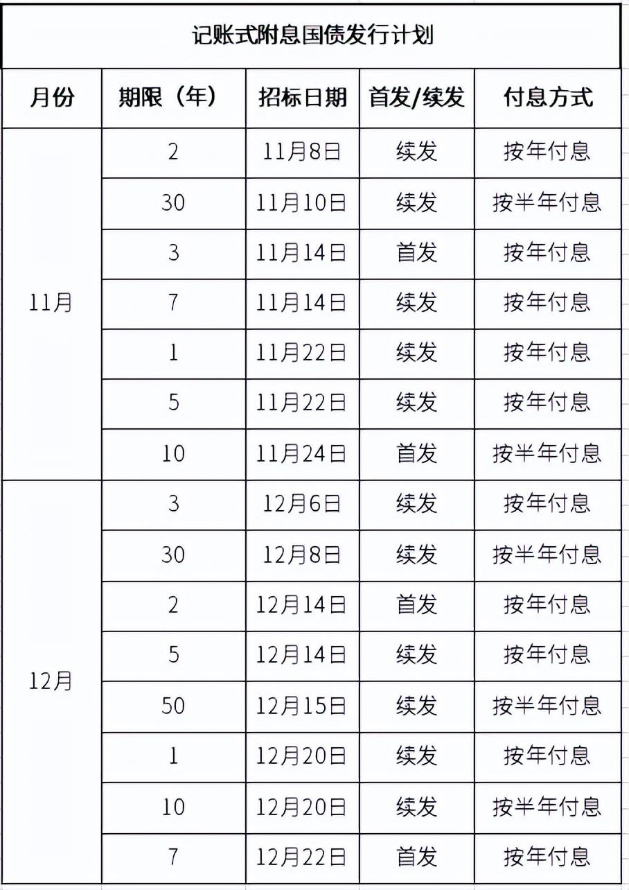 根据四季度的国债发行计划,未来两个月里,还有多批记账式国债和一批储蓄国债要发行,下方为即将要发行的国债的情况: