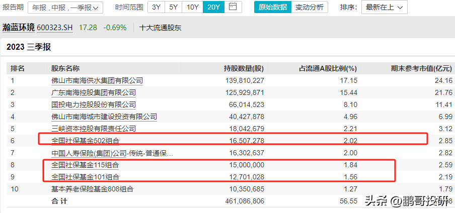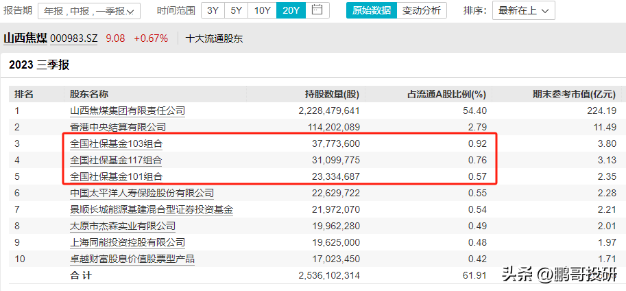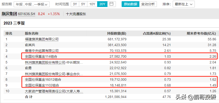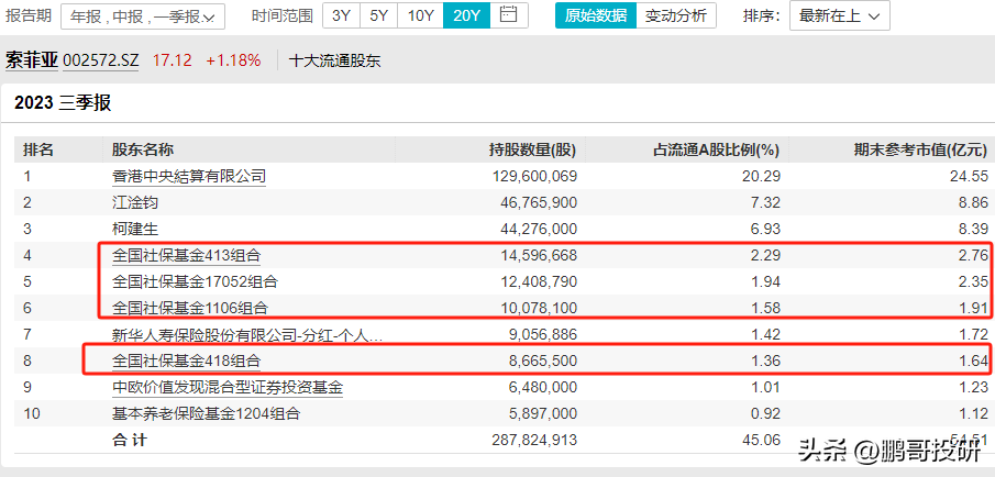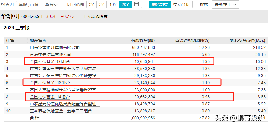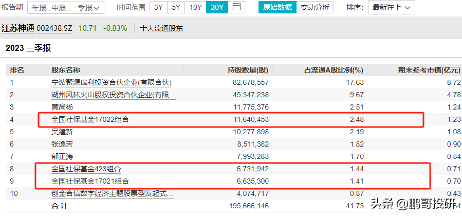 全国社保基金413组合是第四大流通股东,社保基金17052组合是第五大流通股东,社保基金1106组合是第六大股东,社保基金418组合是第八大股东,就连基本养老保险基金1204组合也是第十大流通股东;