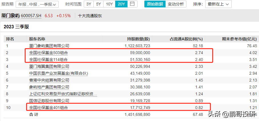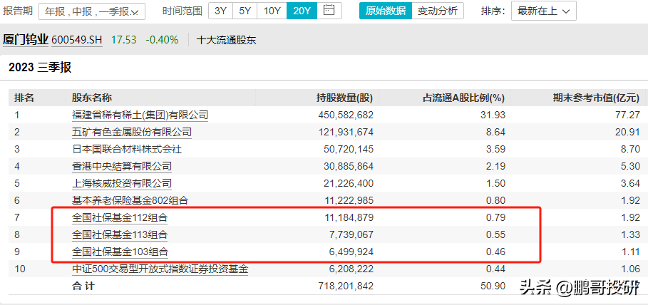 全国社保基金503组合是第二大流通股东,社保基金114组合是第三大流通股东,社保基金401组合是第十大流通股东;