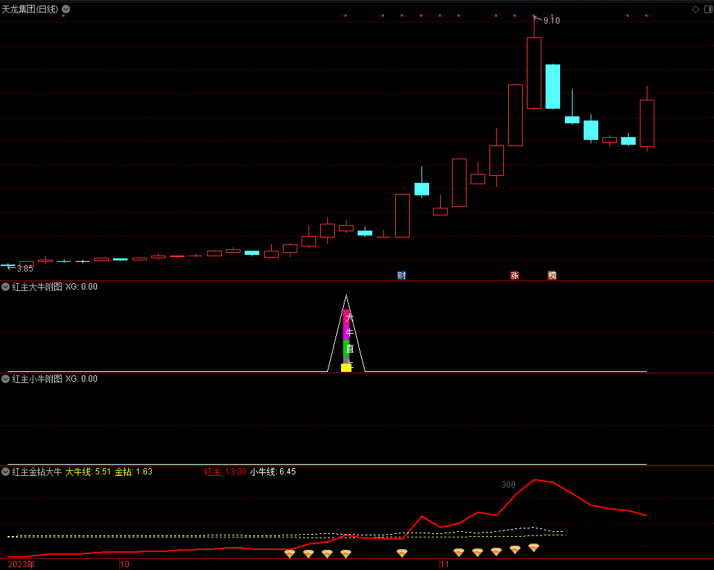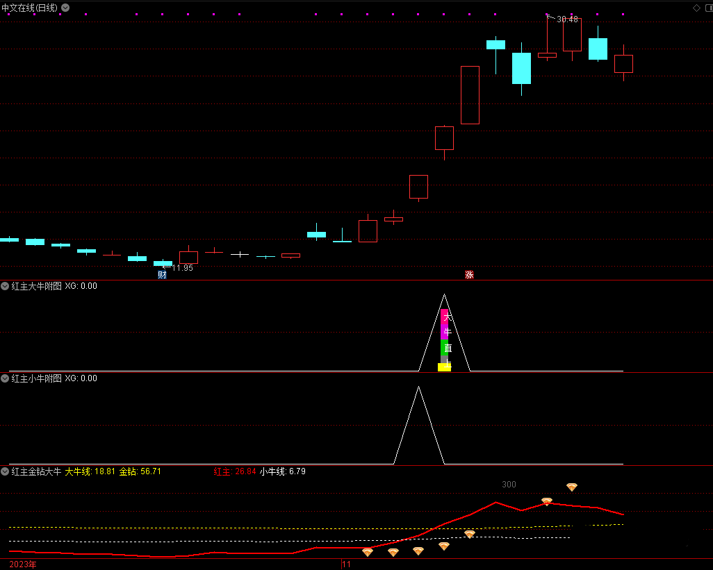 红主线上穿小牛线(白色)+金钻出现=小牛信号,已经做好选股公式,信号较多