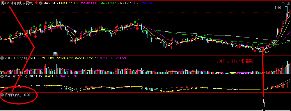 2、短期均线从向下杀到走平到向上的时候,小阴小阳不断,阳变多,刚刚弱转强时出信号;
