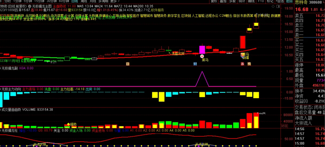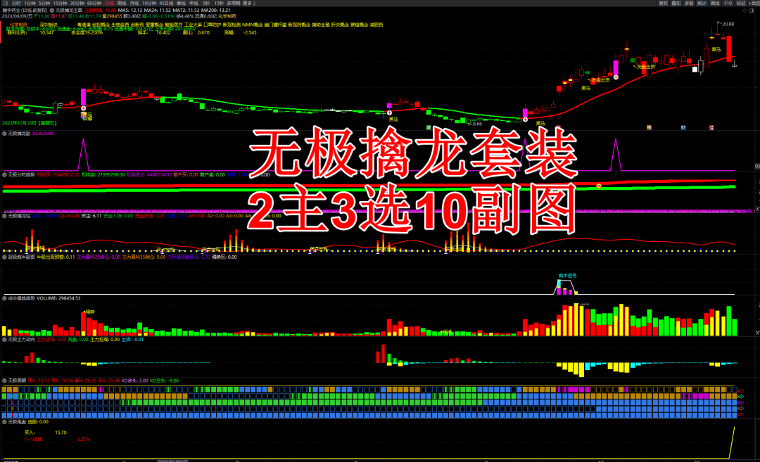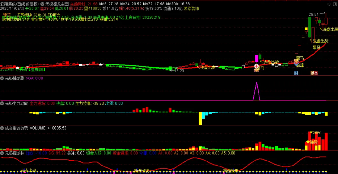 无极擒龙指标我们可以使用一个主图和四个副图的界面进行个股的分析界面,无极擒龙主图主要是判断市场的目前趋势是多头还是空头,对比量比,换手还有获利筹码,安全度来分析市场目前处于什么样的状态,当趋势处于多头时候,指标显示是红色,空头是绿色很简单!!通过指标的副图可以判断市场成交的趋势,红色代表是比较火热,绿色是空头的力度,还有主力动向一目了然!!!这套指标还有一个尾盘抓股的,尾盘操作成功容易把握和安全性也是比较高,大家可以慢慢研究一下!!!