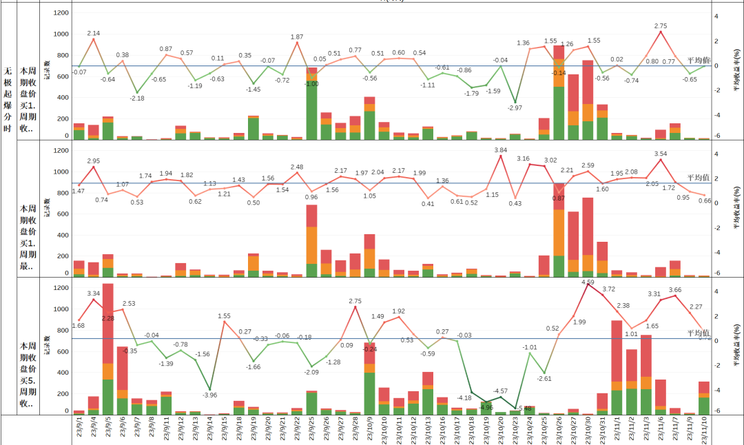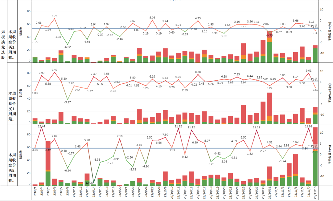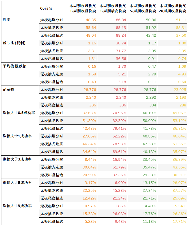 交易周期---指信号当日尾盘买入,1周期为次日尾盘、最高、中价卖出;5周期为5日后尾盘卖出。