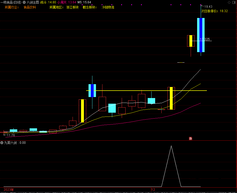 本指标为盘中预警,强势股可等回踩均线买入,注意:盘中预警当天信号会消失,只有在尾盘信号才能固定,本月的一鸣食品四连扳