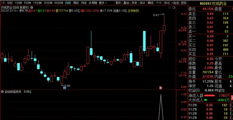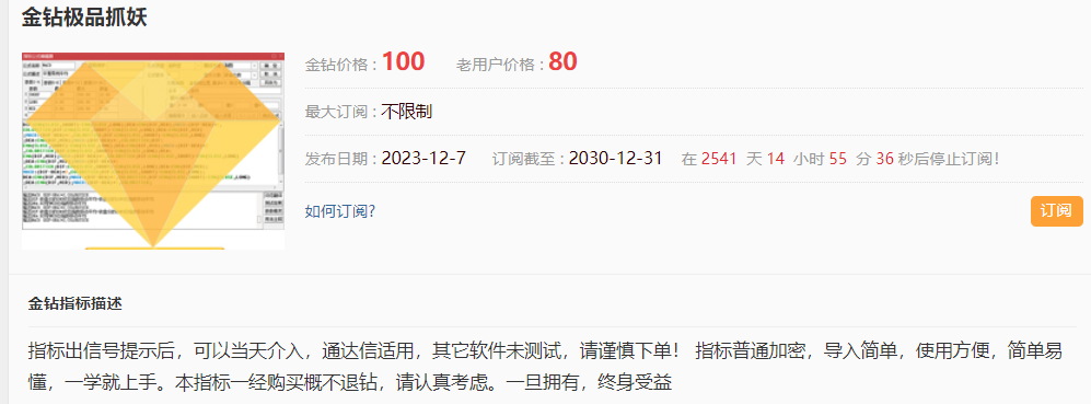 指标出信号提示后,可以当天介入,操作简单,无需盯盘,不做选择题!【极品抓妖】专注短线走势爆发力强的个股,指标结合当前情况进行创新,利用惯性原理,历史重演,连续涨停的票有其惯性去冲击强势涨停的定义;指标信号少每天仅三四只左右,虽然少,但能接近转折点这个加速的时候位置!最适合来回振荡并且股性活跃的个股,信号少但准确度高,很多时候隔天都能冲高。