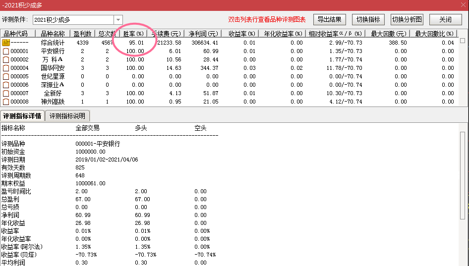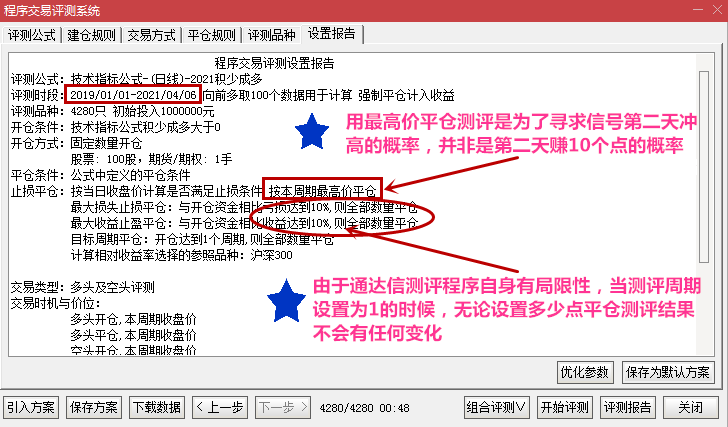 众所周知,在指标的测评中运用最高价平仓测评一般都包含不少猫腻,这里就不作过多讨论。这里,测试周期设置为2019年1月1日至2021年4月6日。评估期限为2年3个月以上。评价周期更长,指标效果更稳定。持股周期为1,最高价评价是求信号第二天走高的概率,而不是第二天10个点的概率,这不是套路。由于通达信测评程序自身有局限性,用最高价测试,持股周期为1,无论是设置10个点或者一个点止盈止损,测试出来的结果都不会有任何变化。但作为一款今买明卖类型指标,指标出信号当天尾盘入,第二天盘中冲高就出,用最高价测评中寻找到第二天能冲高出局机会的概率是可行的,毕竟我们不需要等到第二天收盘的时候才卖出。经测评,本指标在测评周期内出信号第二天盘中冲高概率95%左右。