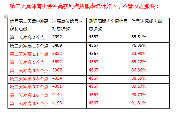到这里大家应该豁然开朗了吧。编写第二天赚一个点两个点甚至三个点的优秀指标的老师有很多,但是能具体量化到第二天能冲高获利点数的概率的老师并没有。上面表格能很好的把在统计周期内相应冲高点位概率直接量化出来,这样既有第二天冲高概率统计,还有具体盈利点概率的量化结果。每个人心里真的能有个底,根据上面的统计,大概能知道第二天哪里能止盈,哪里能止损。这也反映了该指标的微利运行模式。