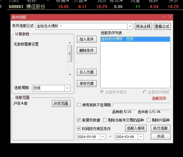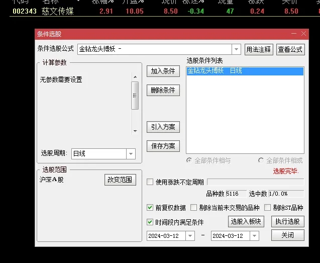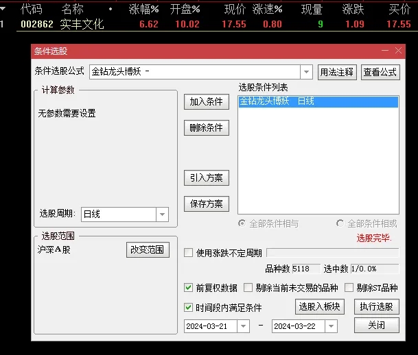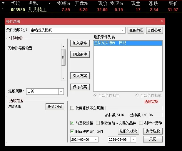设置自动选股,指标集合后25分一键选出即可,或者集合后手工选出;建议先小仓位稳健操作,适应后再考虑增仓;指标经实践测试,胜率高,波动小,稳定性好;