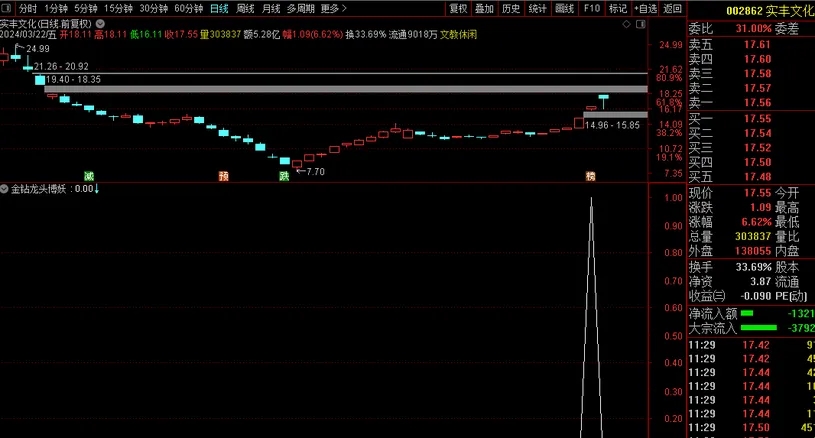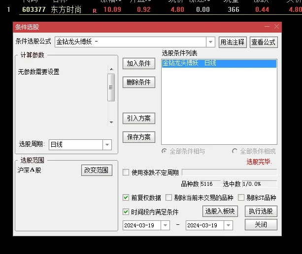 2、指标无使用时间限制、免费升级、无未来;经测试指标含有:CAPITAL,DYNAINFO,FINANCE,这三个函数,CAPITAL这个是流通市值对信号无影响,DYNAINFO{15}是开盘金额,当天就固定了也不会对信号有影响。FINANCE(46)是自由流通股本也不会有信号有影响,信号只有维持到当天的收盘才能固定下来,如果收盘股价下跌那么就不符合信号了信号就会消失,这是正常的,只要信号能维持到收盘固定后那么后期信号是不会漂移的,所以请知晓这个。