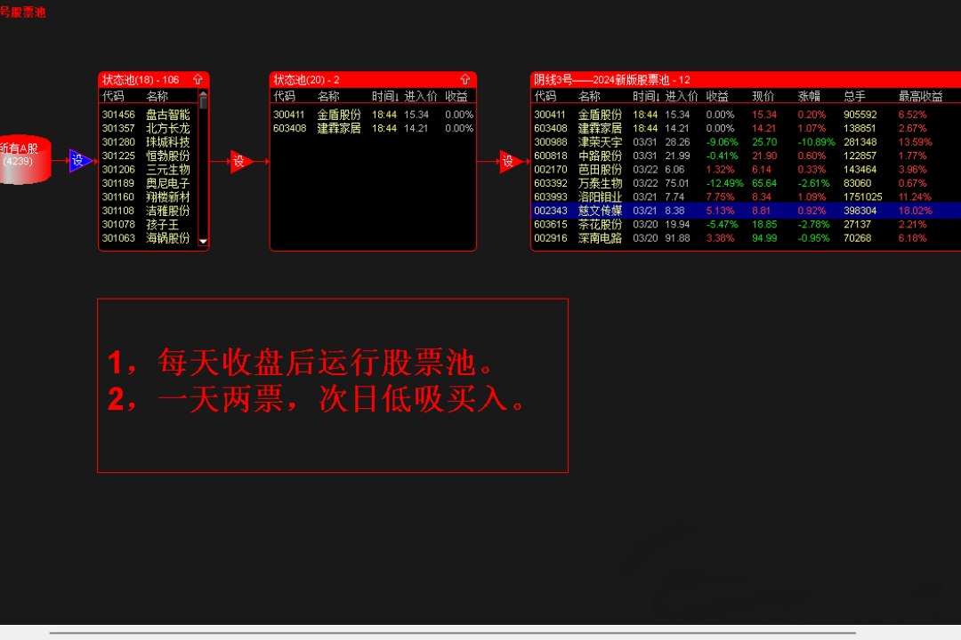 《阴线3号》2024新版股票池,股票池选股,每天2个,收盘后选股,第2天低吸。