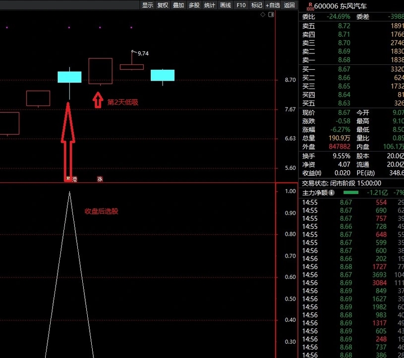 指标使用方法:收盘后选股,股票池每天只选出来2个,第2天再择机低吸。