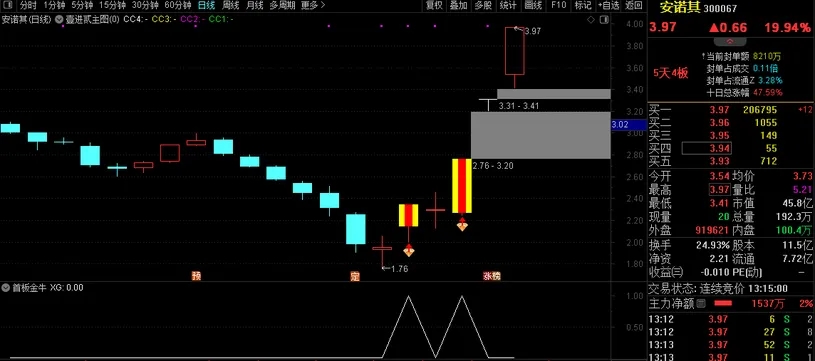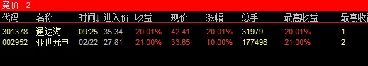 竞价排序初选强势票进行首单排序也是选排名第1,通过测试数据显现,指标成功率高,排序排名第一的优点是受益幅度大。指标包括主、副、选、排序指标共6个无加密指标。排序跟选股是需要搭配使用,早盘竞价时间使用,信号仅供参考,由于《首板金牛》需要选股跟排序搭配使用才能在竞价时间只选出1只,所以只能电脑通达信使用,手机无法两者搭配使用,仅供参考!当然你也可以用电脑直接《壹进贰》排序锁定排名第1的票盘中择机介入,这也是个不错的选择。