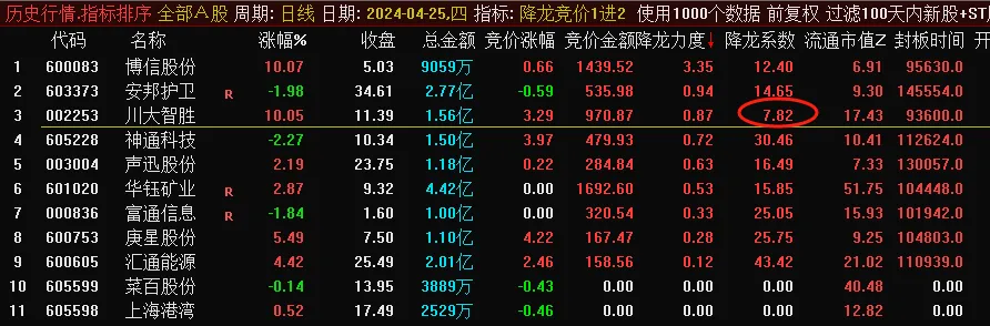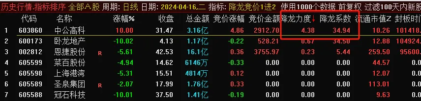 我们将降龙力度进行排序,从高到低,首先看第一个,如果降龙力度排第一,同时降龙系数大于35,那么别往下看,就是第一个直接干,如果排在第一的降龙系数不够大,再往下看,最多看到第四个,看降龙系数最大的;