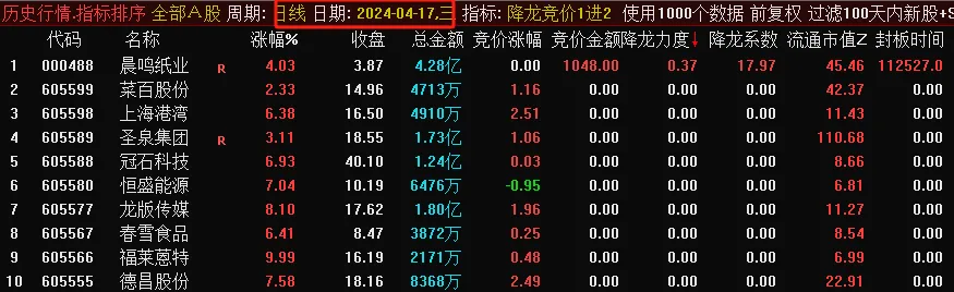 本指标是排序指标,集合竞价选股的结果可以回看历史数据,凡是不能回测历史的竞价系统,全部都是垃圾;