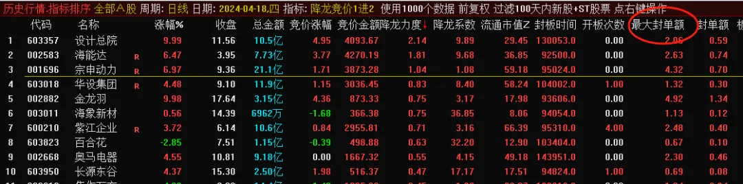我们看降龙力度前四的股票中,谁的最大封单额那一项最大,就选谁,最大封单额指的是盘中涨停板买一位置最多曾经有多少资金在排队,资金越多,说明看好的人越多,宗申动力是4.32亿元的最大封单额,那就选他;