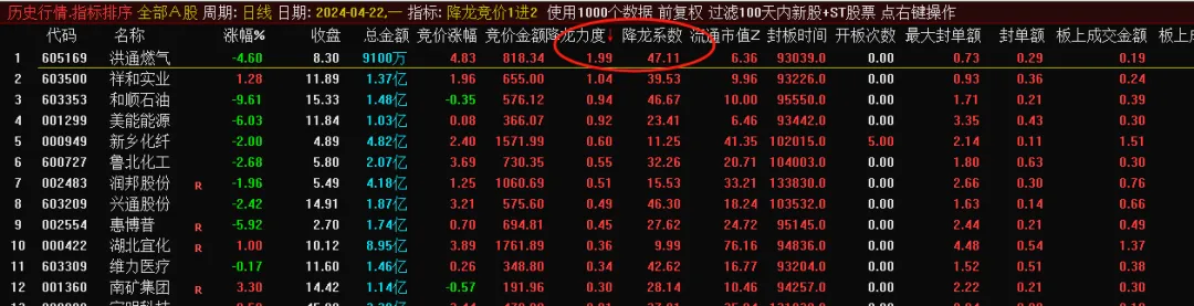 降龙力度第一的是洪通燃气,降龙系数47,符合条件,当天吃面,但是次日反包涨停;