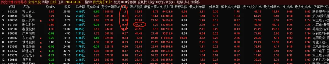降龙力度第一的吉大正元,降龙系数不行,太小了,张家界、航天长峰,两个的降龙系数都不大,只有利仁科技,降龙系数44,符合条件,当天涨停,次日继续涨停开盘,炸板离场;