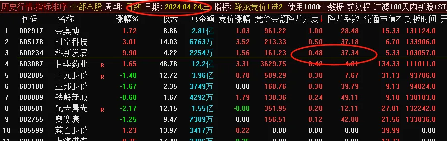 降龙力度排第一的金奥博,降龙系数不算太高,因为下面有比他更高的,第三个科新发展,降龙系数符合条件,入选,这是当天除了创业板外,主板里面一进二唯一成功的一个,降龙竞价系统选到了;