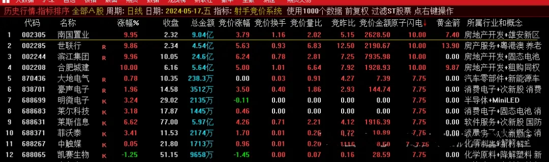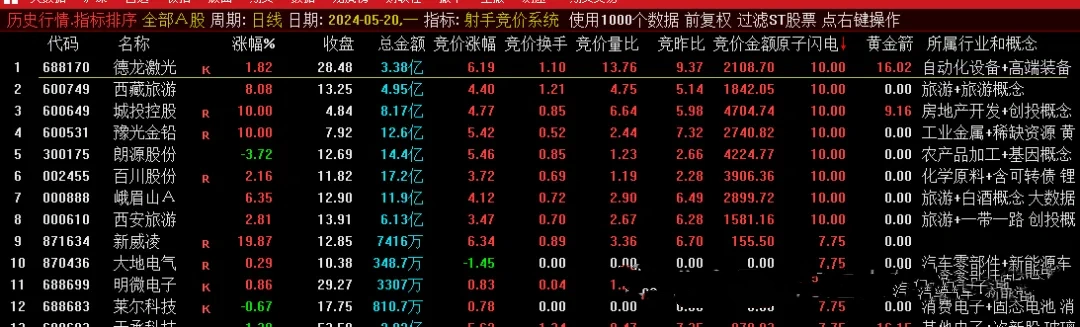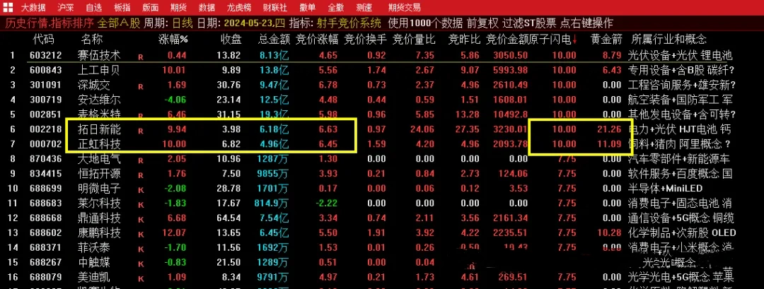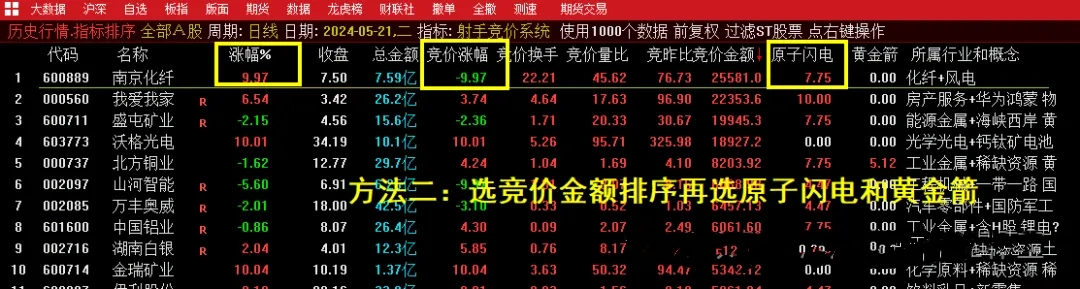 按照竞价金额对全市场进行排序,然后看原子闪电和黄金箭两个信号