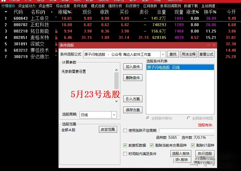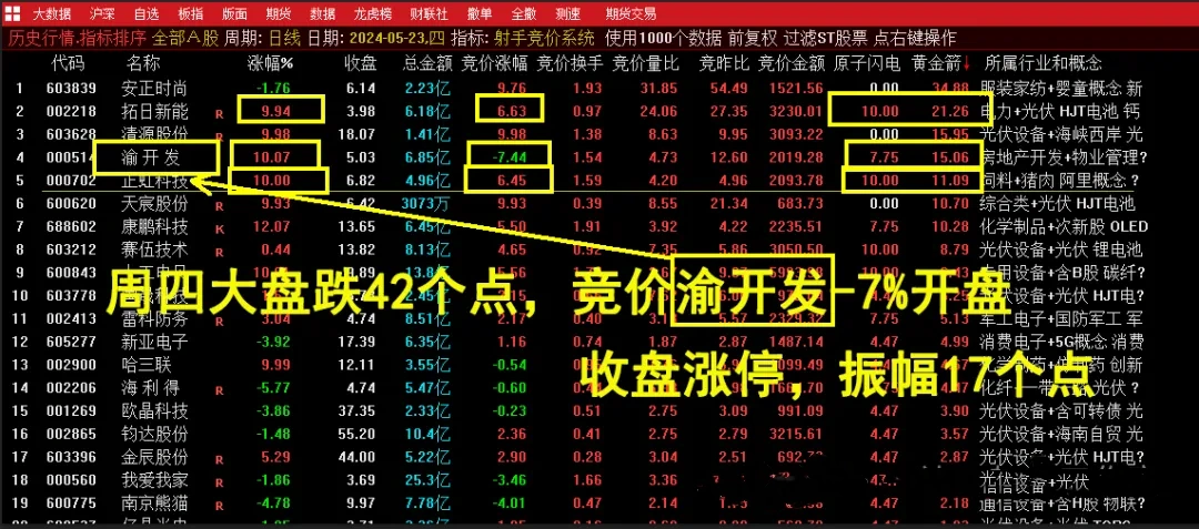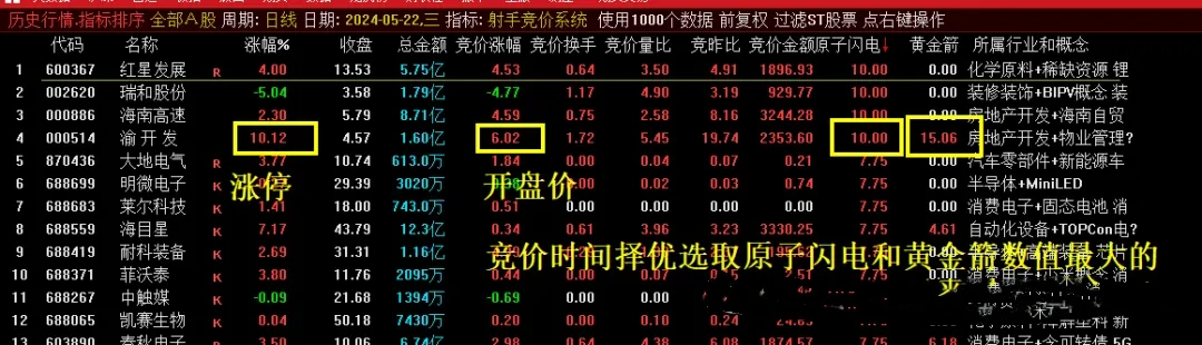 9点25分竞价排序,选择原子闪电和黄金箭数值都大的作为参考,比如5月22号那天竞价的渝开发,原子闪电数值是10,黄金箭数值是15,比如5月23号那天竞价的渝开发,原子闪电数值是7.75,黄金箭数值是15,振幅17%,就可以作为参考,后期会优化个选股信号
