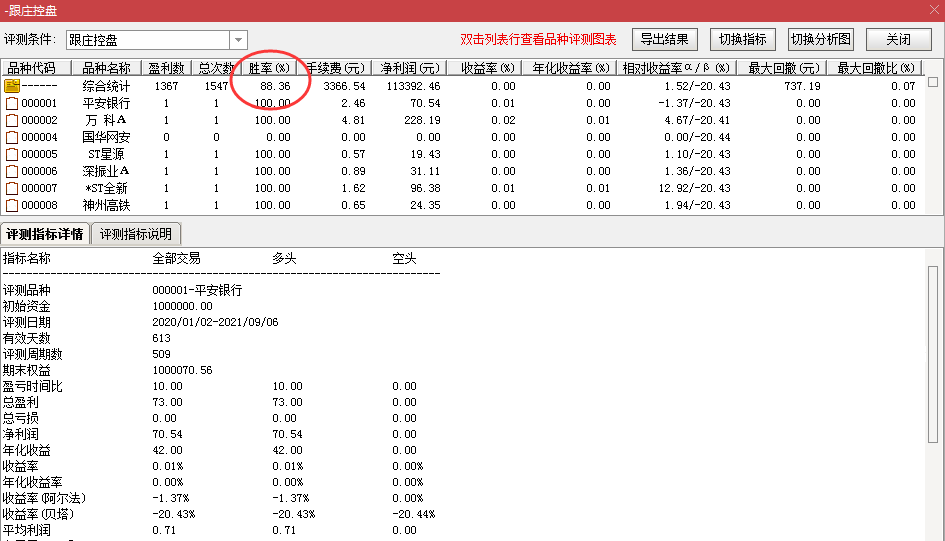 三、指标展示持股4周期与持股10周期测试结果,即短线中线兼顾。2020年1月1日-2021年9月6日,测试持股周期内胜率90%左右,(详情可看测评数据截图)。
