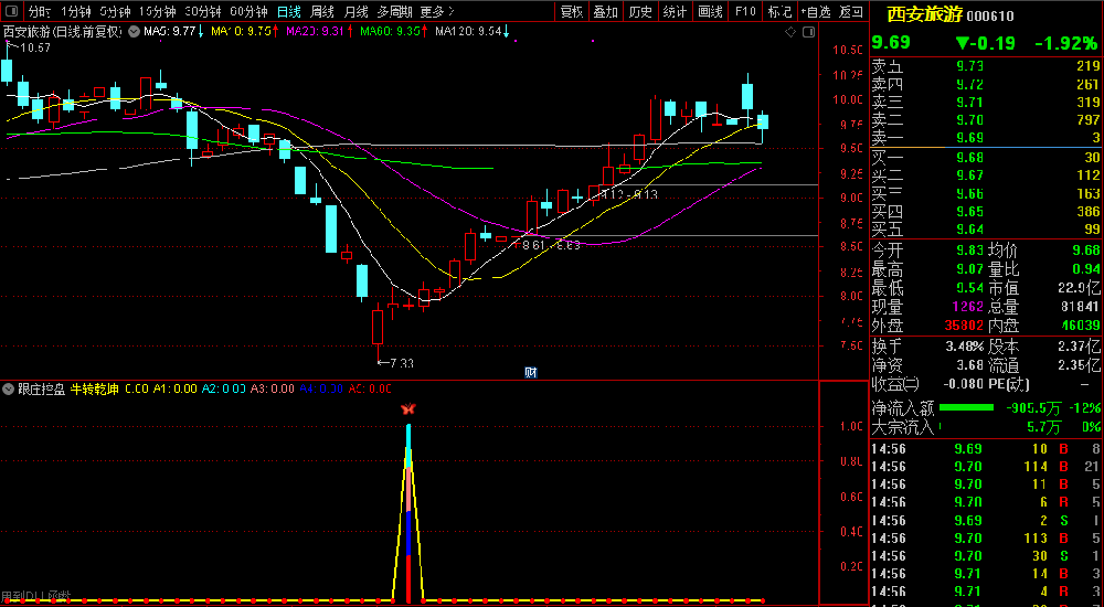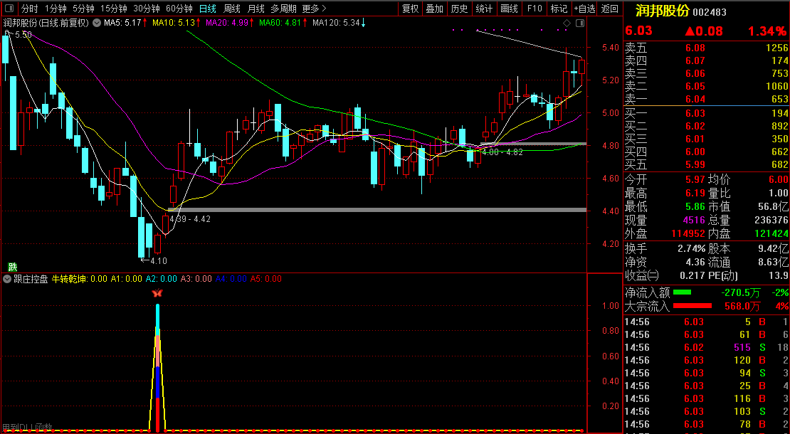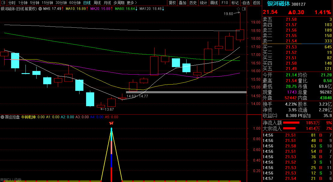 【跟庄控盘】指标介入时机:使用指标可尾盘收盘前3分钟左右信号确定介入或者出信号后第二、三天回调逢低介入 ,也可以在中线周期即10个周期内来回做T。