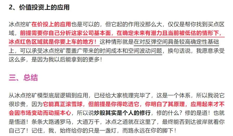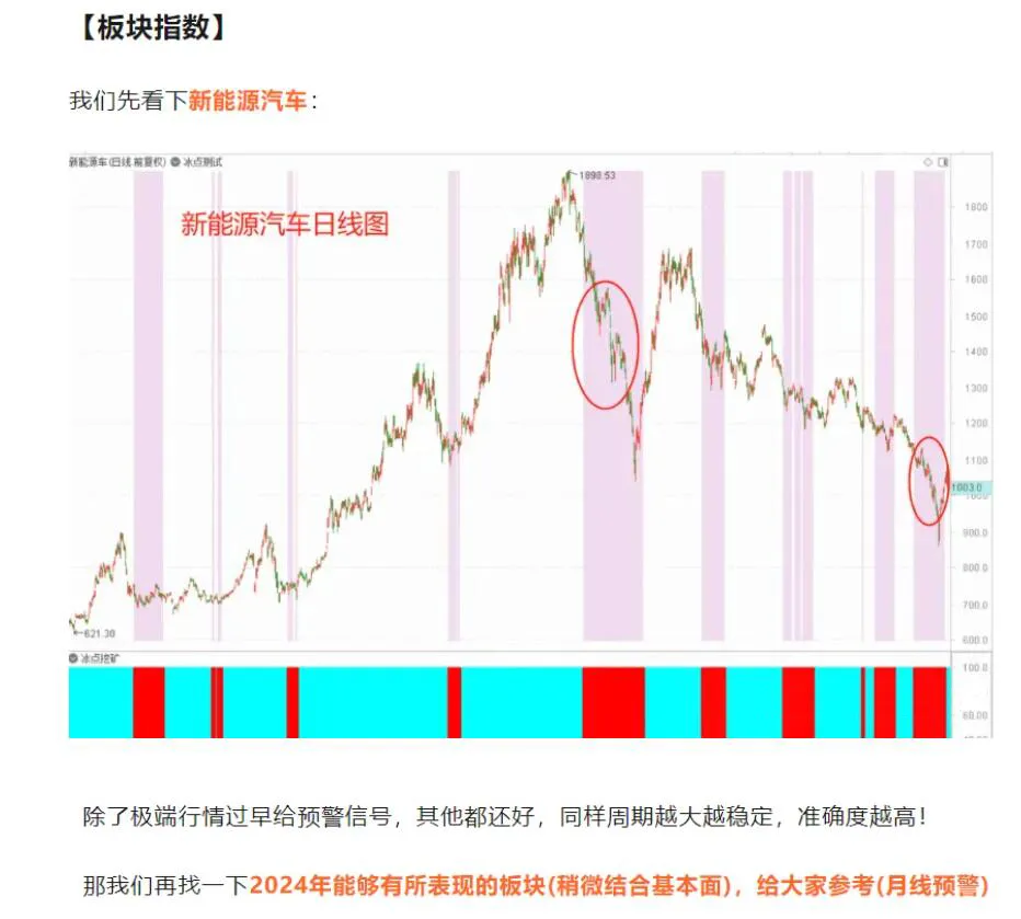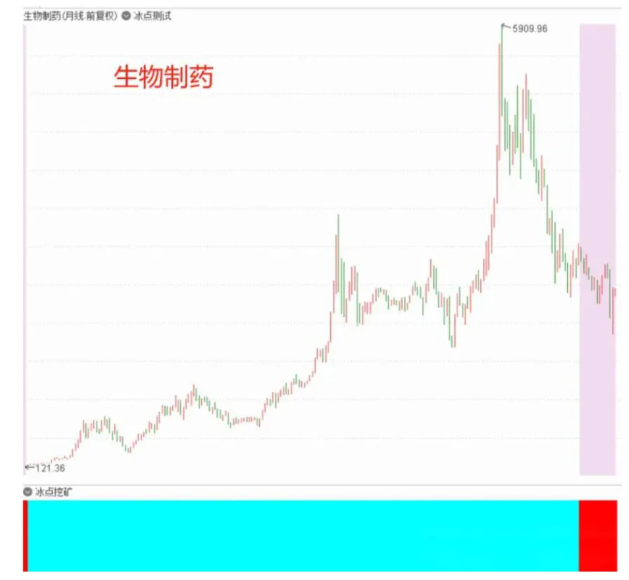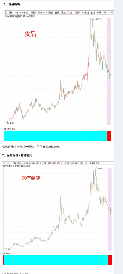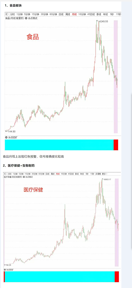 总而言之,冰点挖矿使用于任何品种,因为走势必完美,中枢也必完美,包括但不限于指数、期货以及个股等等,周期越大信号越稳定,周期越小准确度会逐渐下降。当冰点挖矿失效的时候,那就是中枢出现了往下的移动(概率相对较小),关于冰点模型讲解就到这里了,大家也可以留意一下冰点挖矿月线上给到的板块信号:食品+医药(医疗保健+生物制药)+半导体!