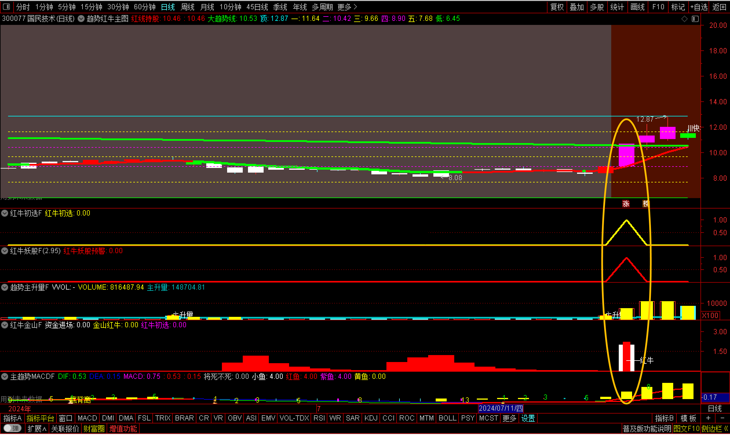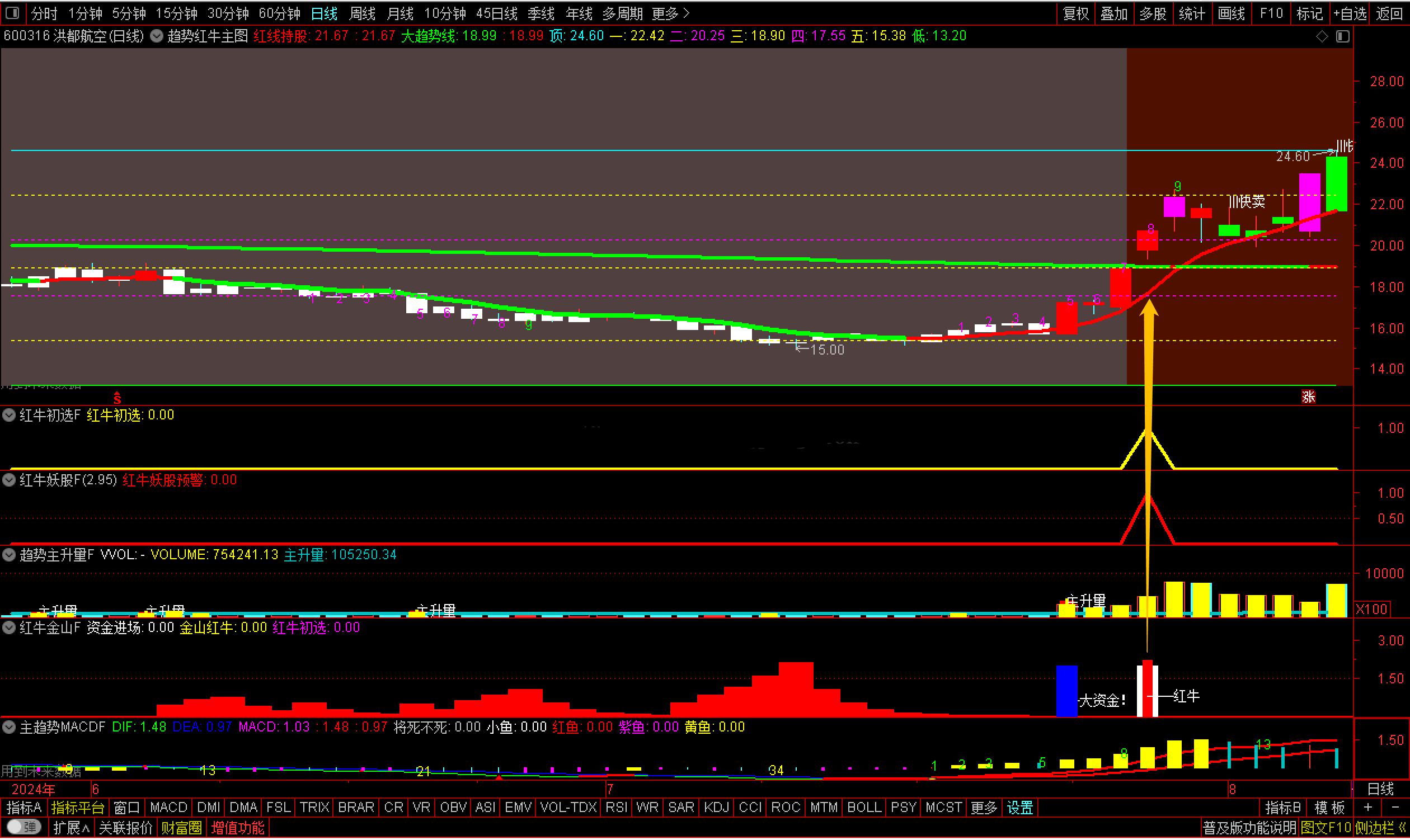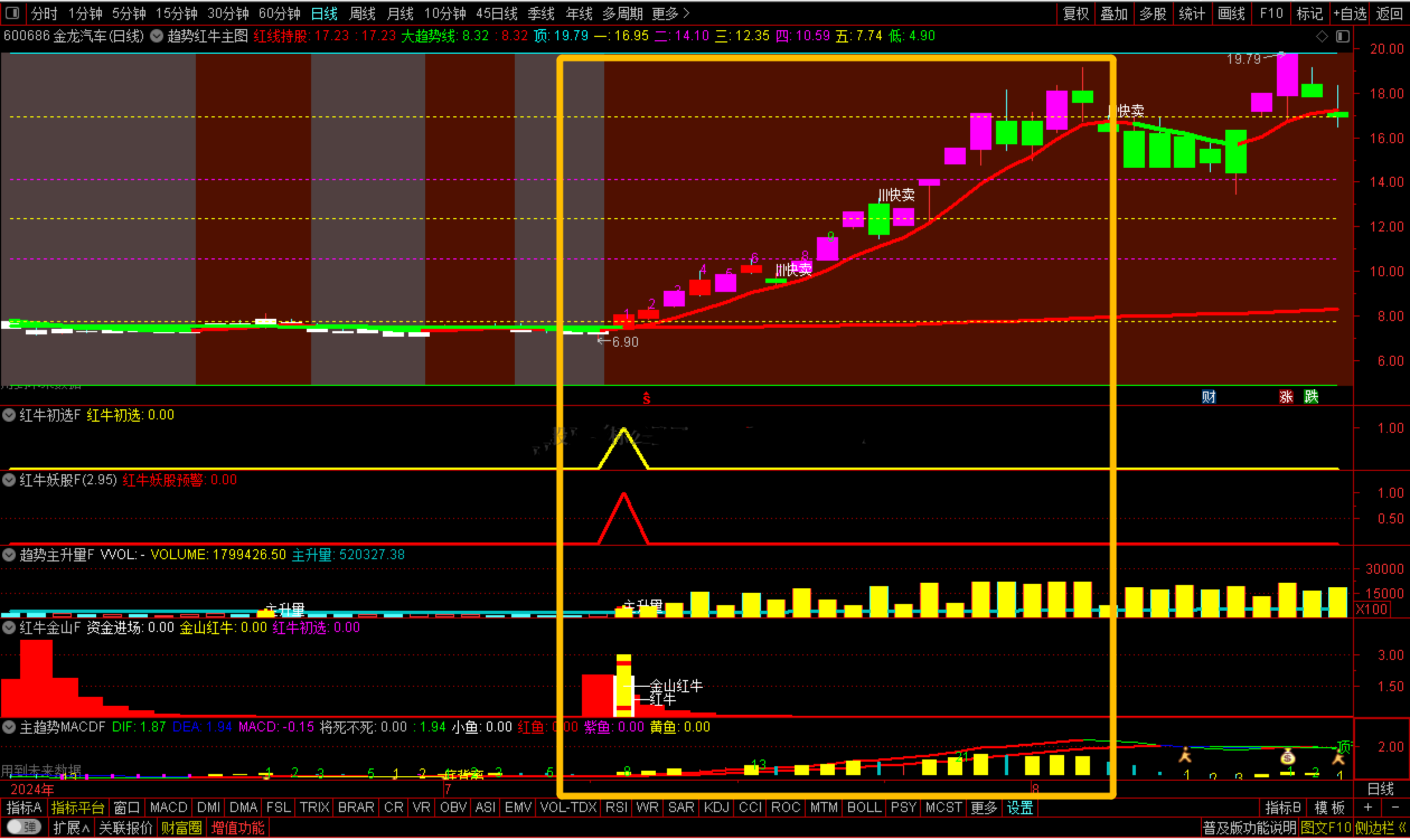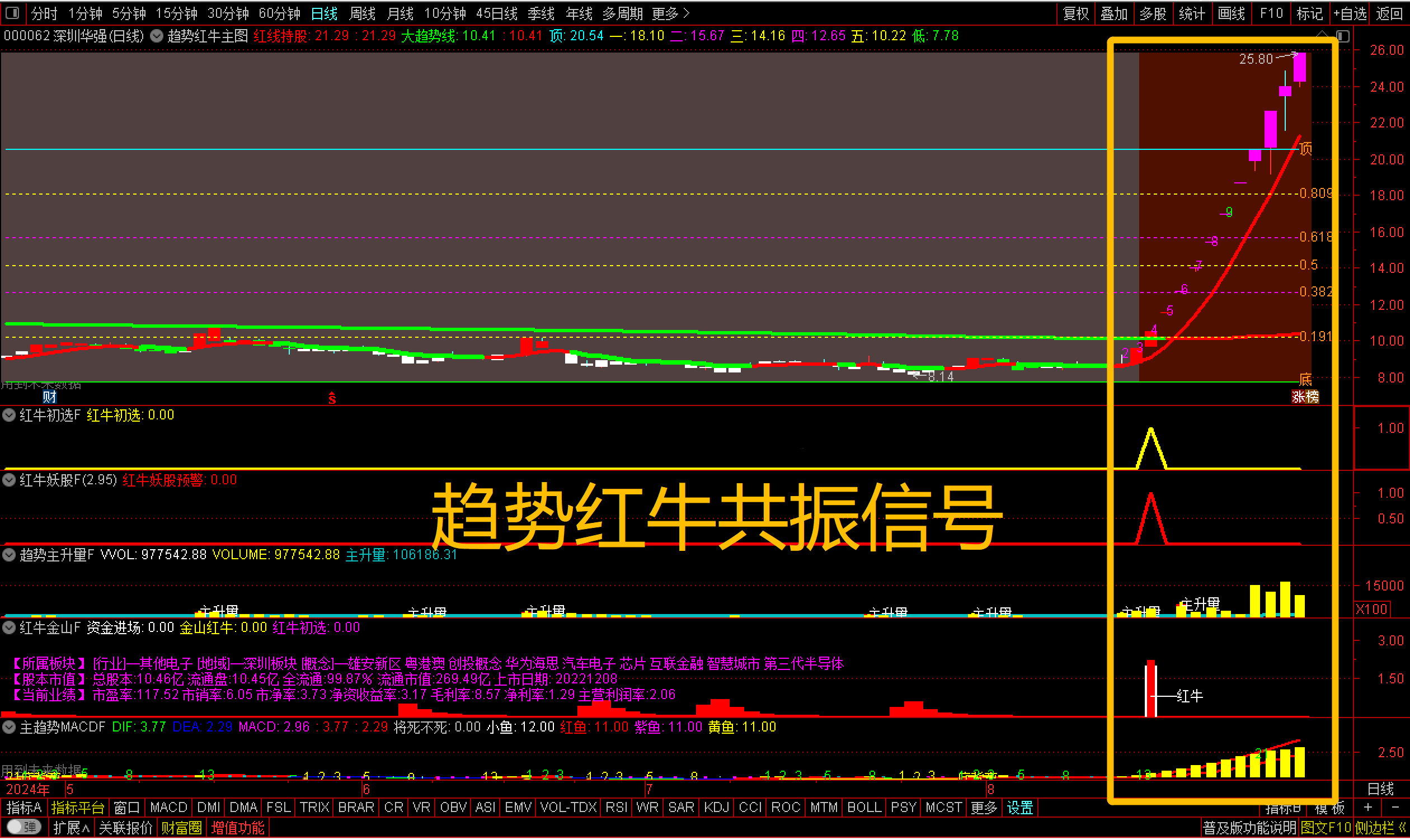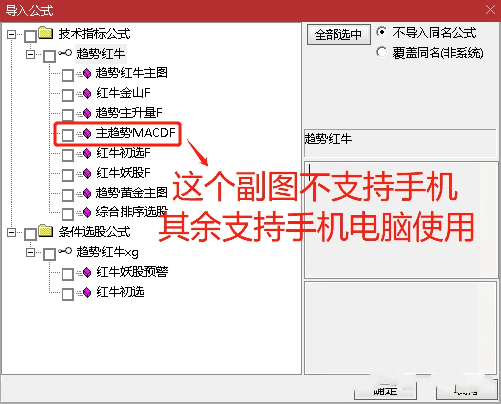 通达信【趋势红牛套装】套装2主图6副图2选股【红牛趋势】套装指标包括2个主图,6个副图,2选股指标,信号不漂移,手机电脑通用(其中主趋势MACD用到周期函数这个手机导入不了其他的都可以导入),信号仅供参考使用方法:红牛初选可以用于尾盘选股,红牛妖股预警可以用于盘中预警使用,另外还有个综合排序附图那个也是用于尾盘排序使用,最好是14点50进行排序{副图主趋势MACDF和主图有函数}选股及信号无未来信号稳定。