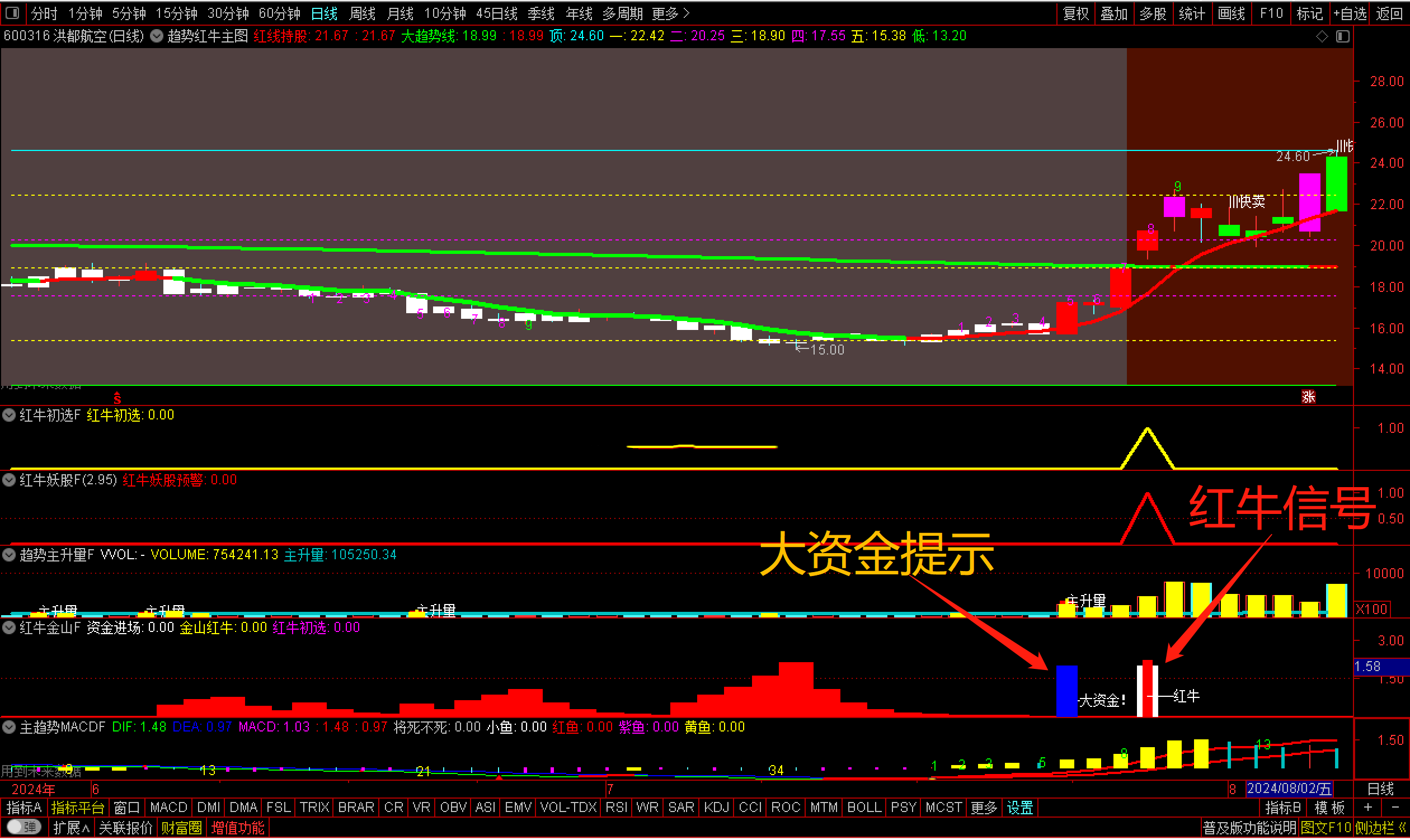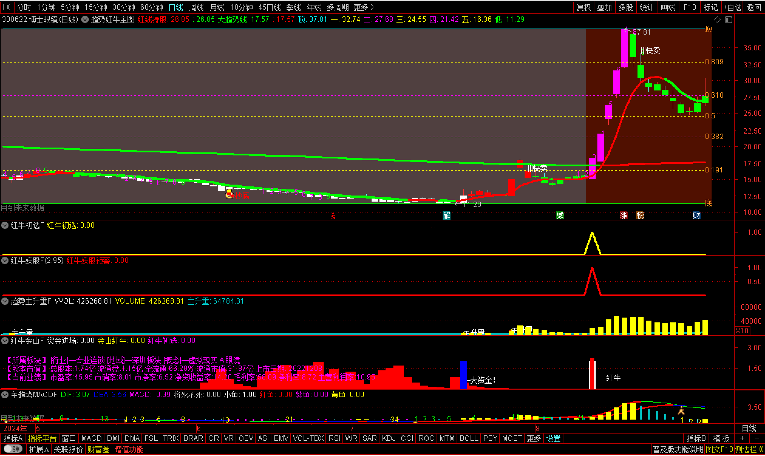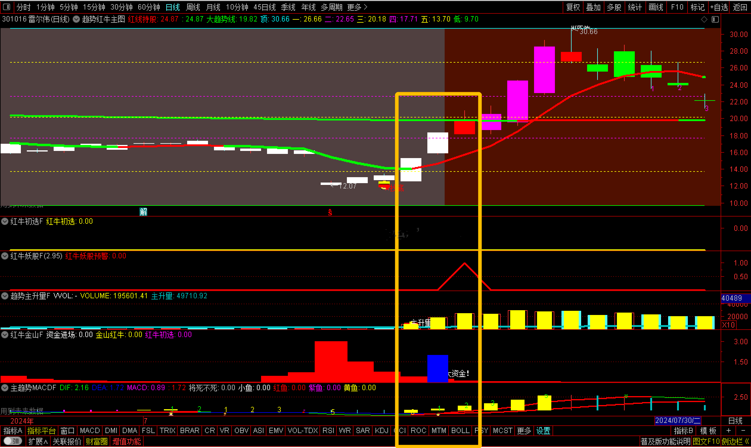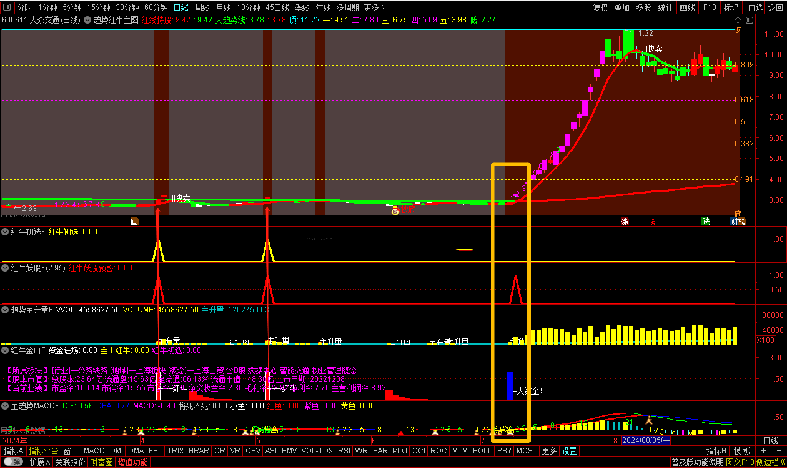 通达信【趋势红牛套装】套装2主图6副图2选股【红牛趋势】套装指标包括2个主图,6个副图,2选股指标,信号不漂移,手机电脑通用(其中主趋势MACD用到周期函数这个手机导入不了其他的都可以导入),信号仅供参考使用方法:红牛初选可以用于尾盘选股,红牛妖股预警可以用于盘中预警使用,另外还有个综合排序附图那个也是用于尾盘排序使用,最好是14点50进行排序{副图主趋势MACDF和主图有函数}选股及信号无未来信号稳定。