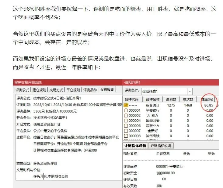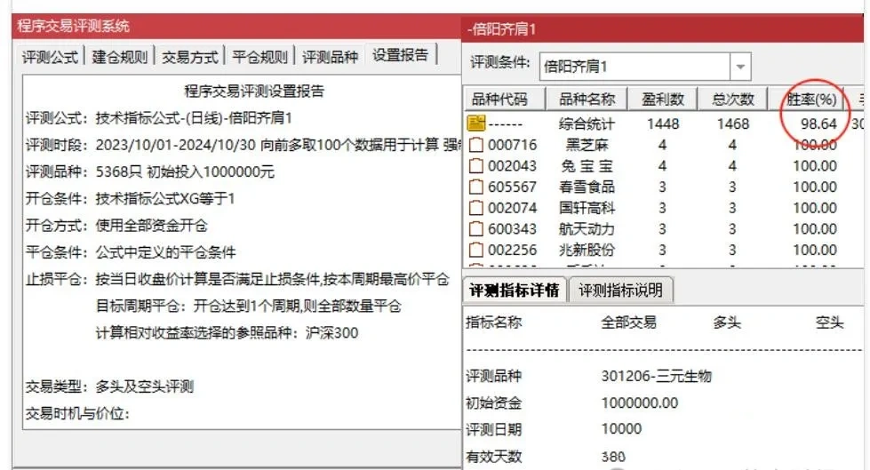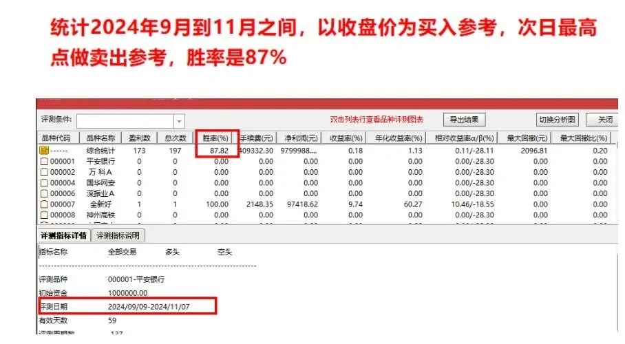 按照这个思路量化后评测最近一年的数据,胜率非常高,下面是评测结果,就是当天买,次日卖的胜率结果: