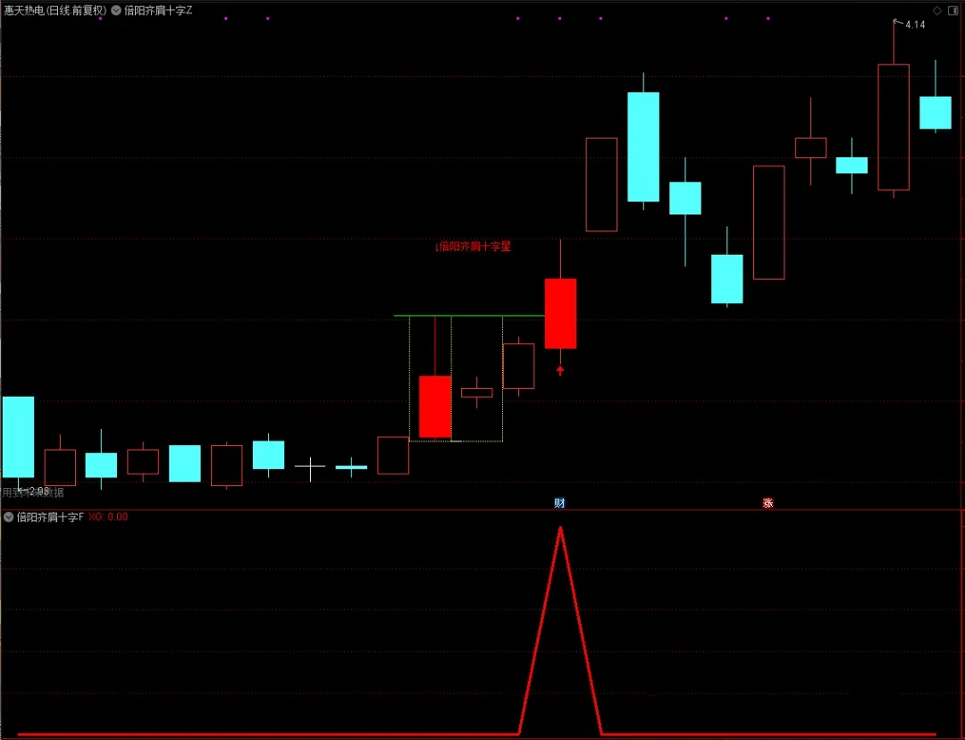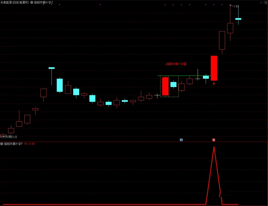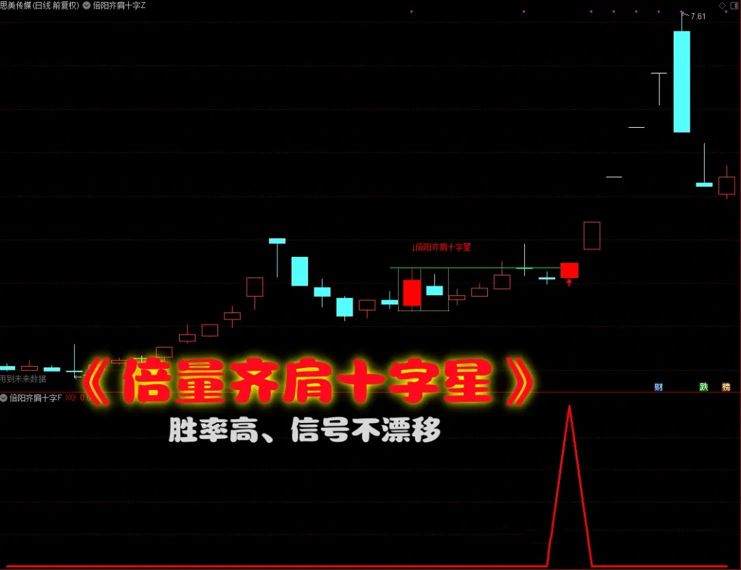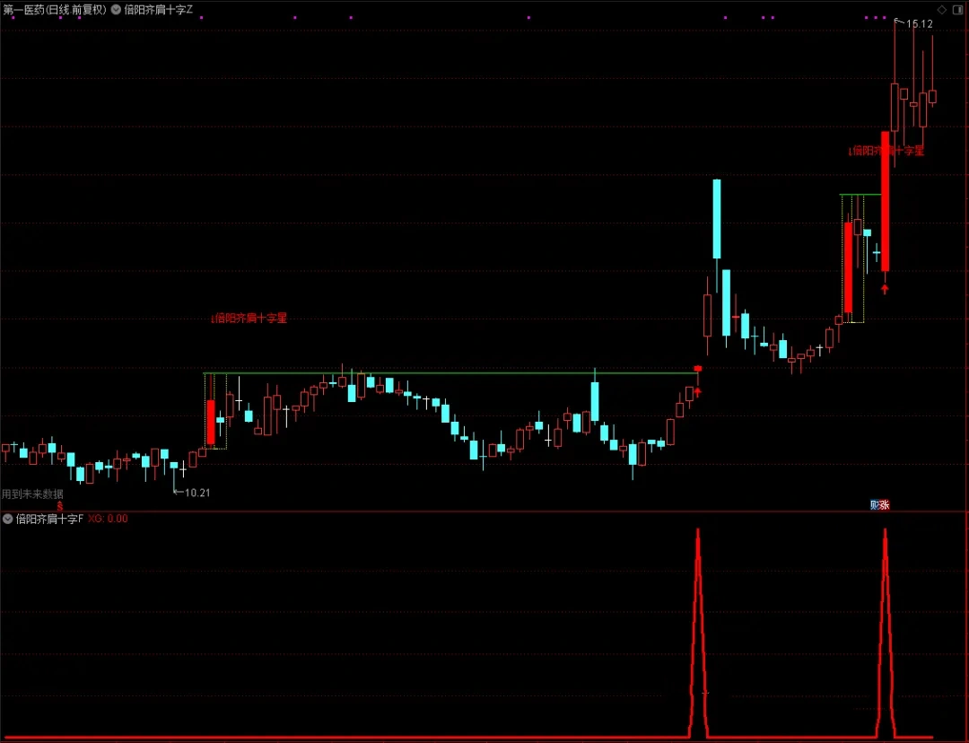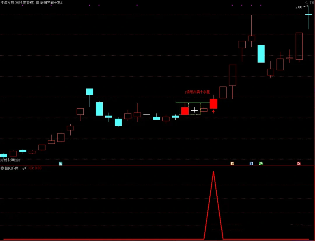 1、主图指标中,出现倍阳齐肩十字星的组合时,倍阳的k线会用红色实体k线标注,同时会画出黄色的虚线方框,在K线组合”的最高点,画出水平的绿色实线,标注红色字体“倍阳齐肩十字星”;