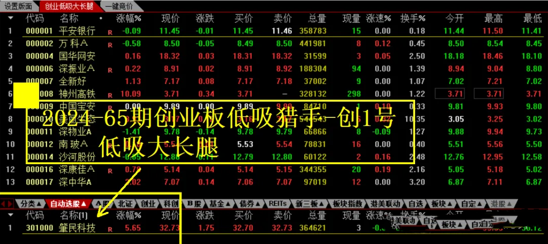 这一专门针对创业板的竞价低吸指标,能够通过精密的量化测算,在竞价开盘幅度处于 5%以内的情况下,准确判断出当天个股最有可能大涨的概率。创业板顶级竟价低吸指标,每天9点25分准时选股,得出最终排序第一的为当日创业板一号票,此票尽可能是当天低吸买入。