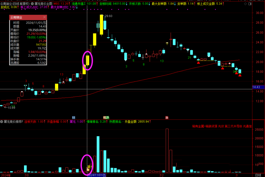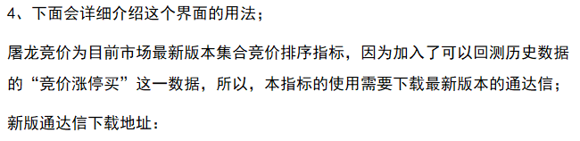 【屠龙竞价】包含一个排序指标(也就是副图指标)、一个主图指标和一个选股指标;其中电脑端全部指标可用,手机端主图选股可用;