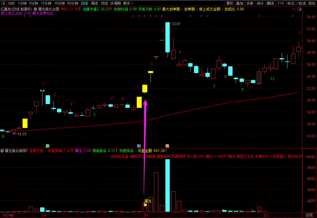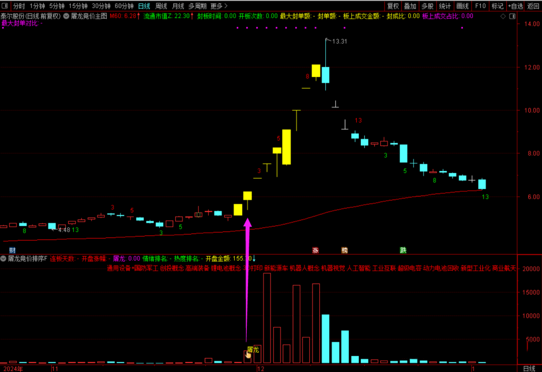 出现屠龙信号的时候,会在竞价金额柱子上方显示金手指图标和“屠龙”字样;屠龙竞价的屠龙信号,出妖股的概率非常高,这个信号是通过竞价涨停买数据的统计回测得出来的结果,两个月以来的龙头妖股捕捉好几只: