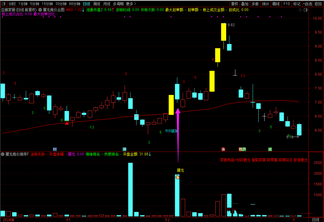 (6):黄色k线代表涨停板,k线中叠加虚线,代表炸板;