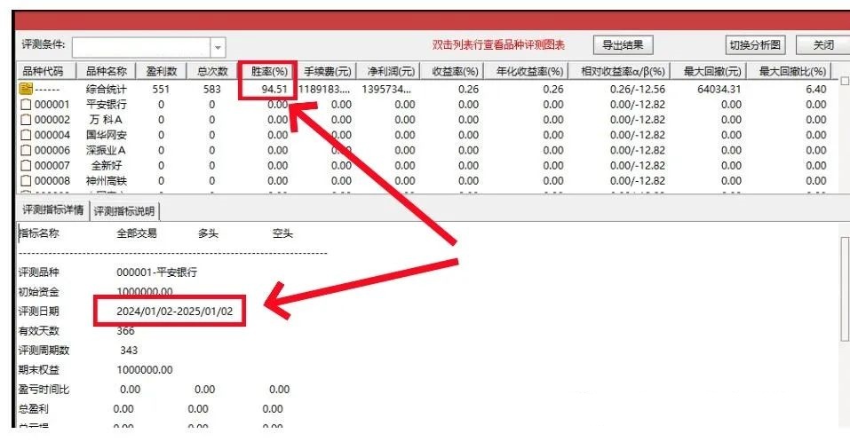 胜率情况:据统计近一个2024年1月6日至2025年1月6日全年范围内,持股一天并在次日以最高价卖出,胜率高达94%。