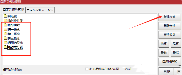 第二步:快捷键“BK”进入新建自定义板块(概念指数,榜一概念 , 榜二概念 , 榜三概念 ,通用选股池 ,最强成分股)名字不要错 (需手动加入概念指数:快捷键615 点左上的概念板块 然后 Ctrl+A 选择批量操作方式加入到 "概念指数"板块)
