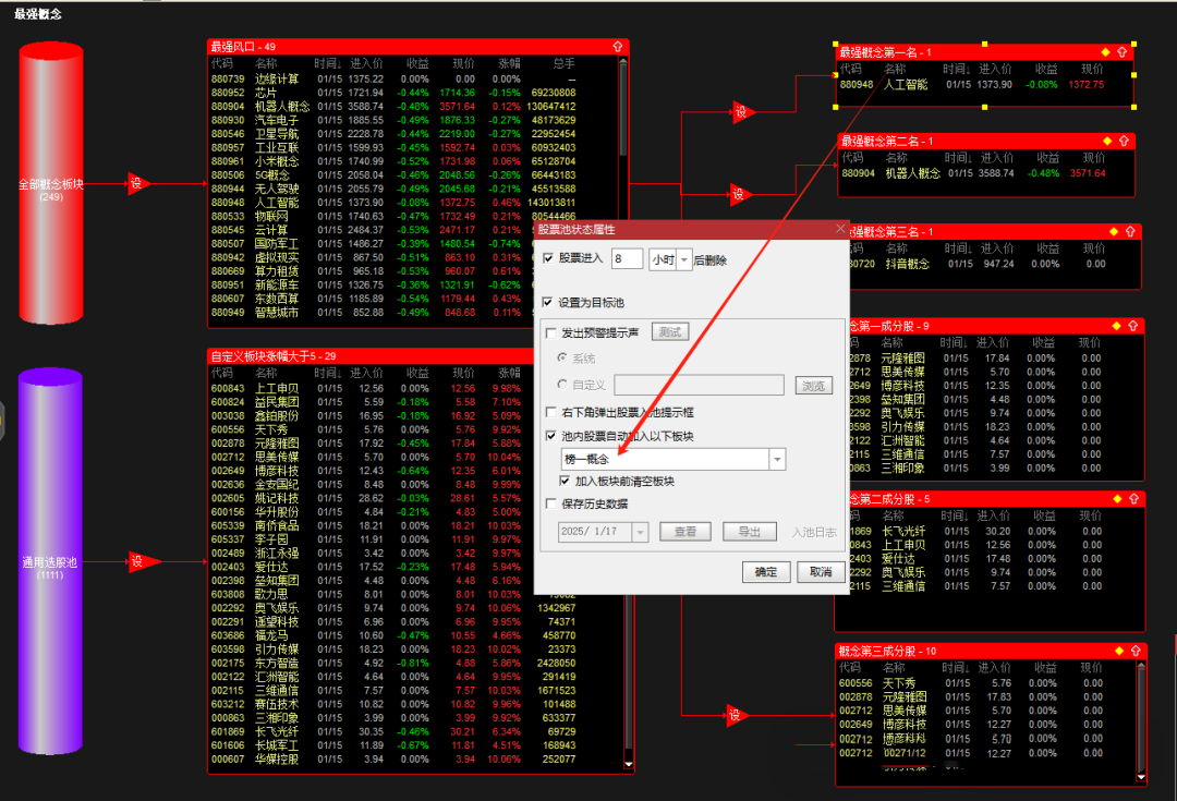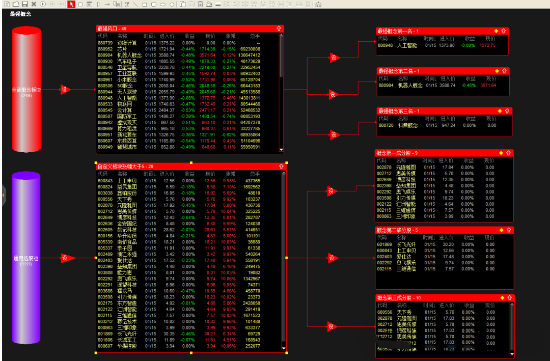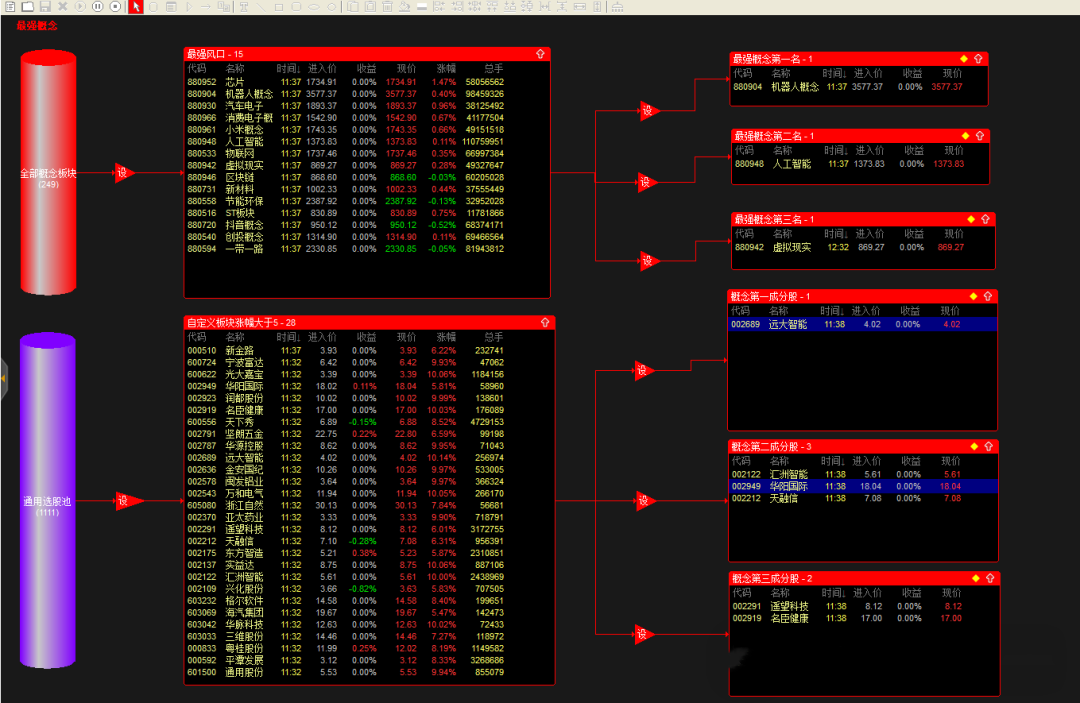 根据概念板块涨停数大于3,筛选最强板块前三,涨幅大于5的成分股。股池出票自动加入到自定义板块,方便操作,不用在开盘后手忙脚乱了。已打包上传。导入股票池和公式即用,已经全部设置好了。执行时间9点32以后 执行时长20分钟。