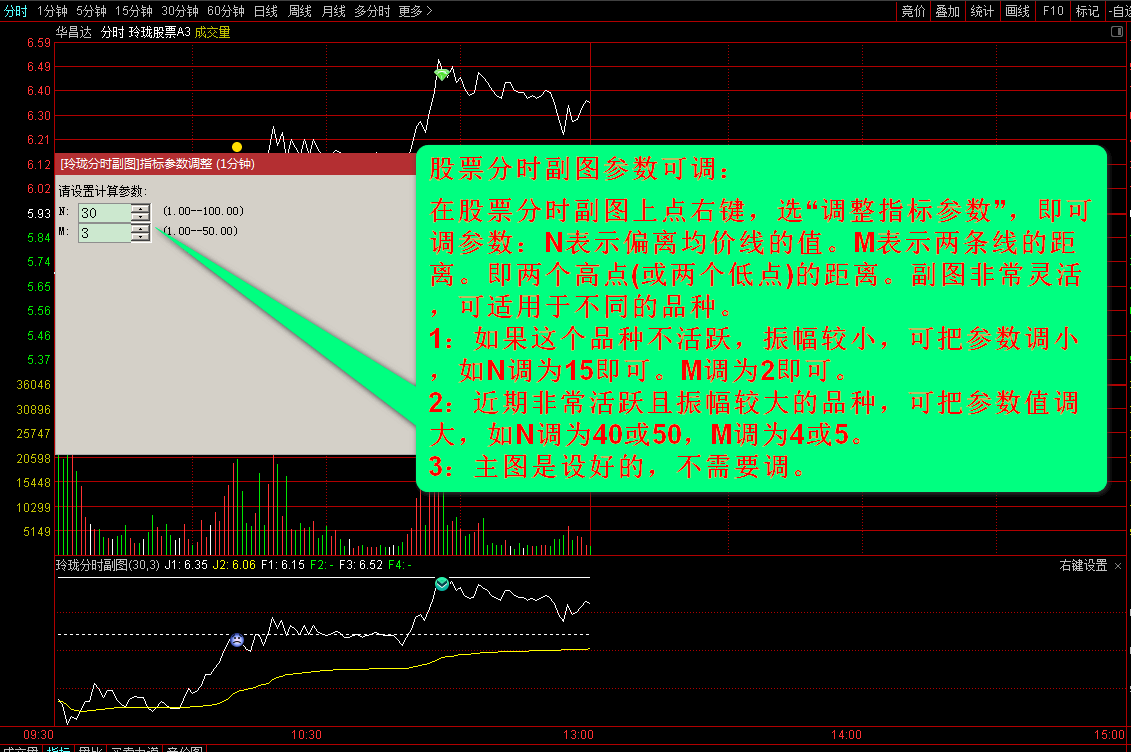 分时副图2默认参数(15,2),适用于相振副小的品种,如一些流通盘特别大且振幅较小的票:如银行股、证券股保险等等其它票,幅度较小的品种,即分时图的参数为(10,2)或(15,2)。直接在辅助图上右键,选择“调整指标参数”,然后改变N或M的个数,很简单。