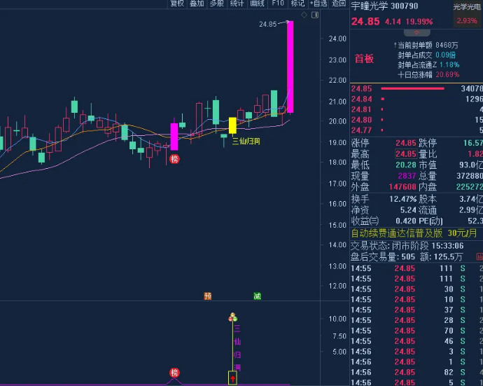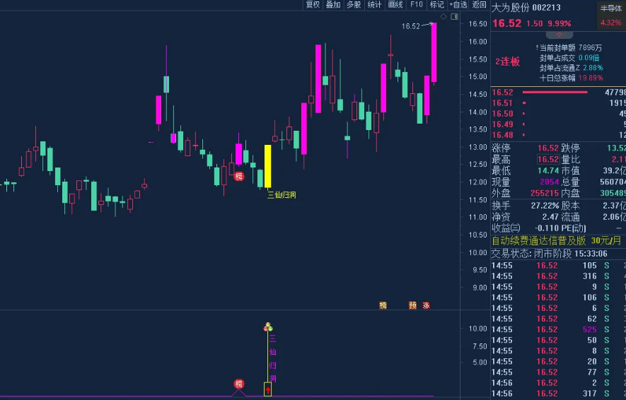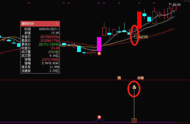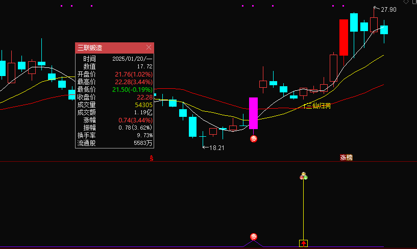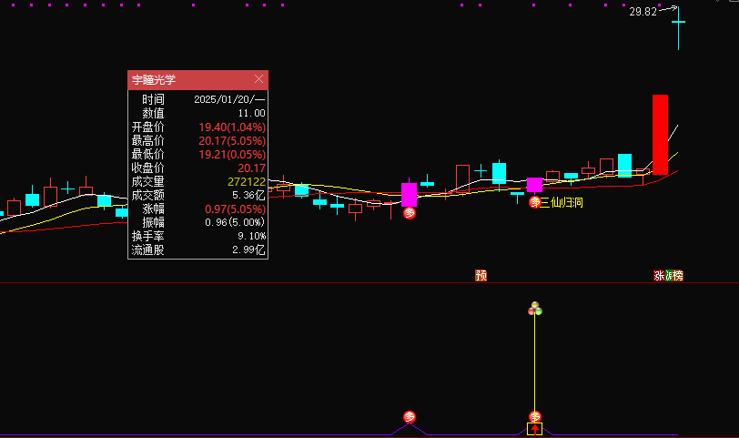主图中的白黄红三条曲线分别是5、10、20日均线,红色实体k线代表涨停板,红底白字的“多”,是标志性k线,同时k线颜色变为紫红色,出现信号显示三仙归洞文字标注;