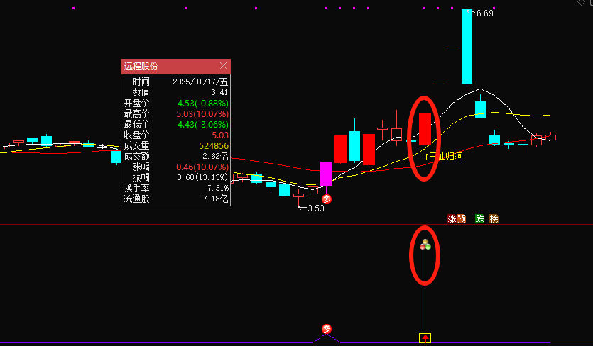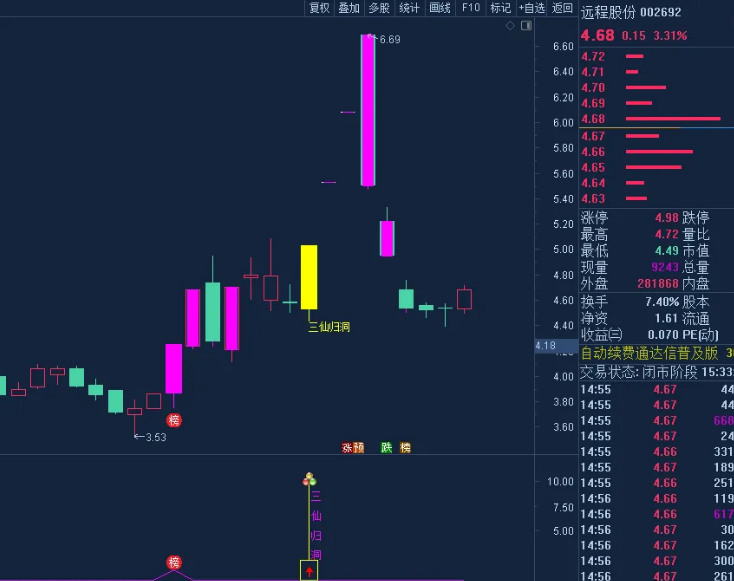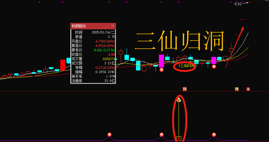 副图的信号是对应的,只是出现三仙归洞信号时,会标注三个圆球的图标,底部加上黄色方框,中间出现红色向上的箭头;