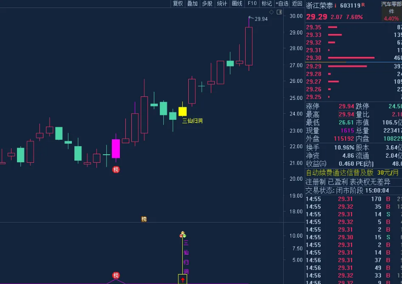 三仙归洞主图、幅图指标显示效果如下: