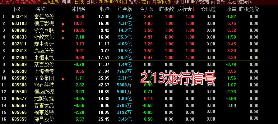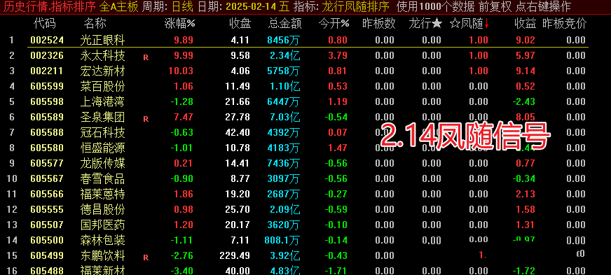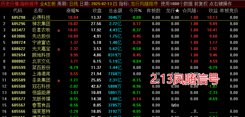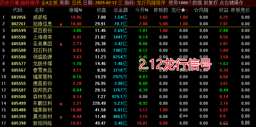 副图信号让排序更清晰显现。排序时,重点关注“龙行 凤随”排序第一的结果,龙行主做连板,凤随主做首版,运行前需确保数据下载完整。