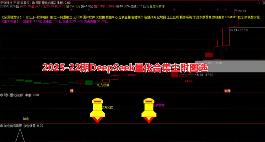 DeepseeK量化合集融合北京炒家 陈小群二板 明轩量化选股 东方不败 幻方抄底、加仓 ,六大知名策略,其中副图+选股无未来函数 (主图这个信号用到划线未来函数)