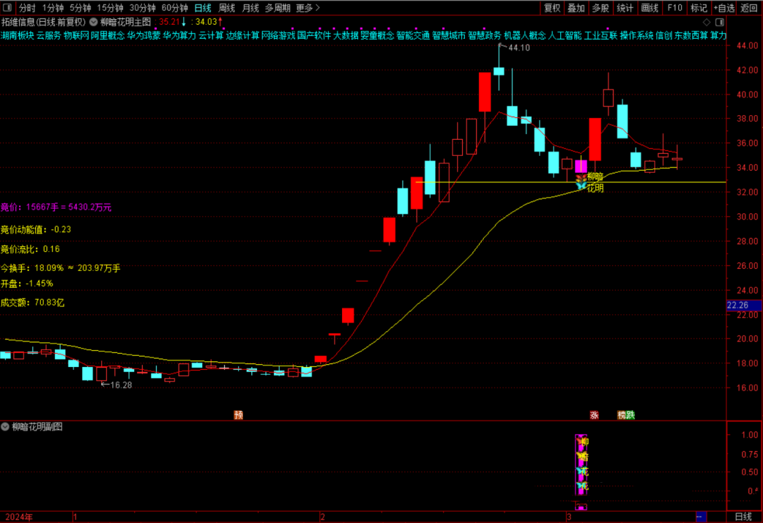 2、根据大盘和个股对应板块调整持仓时间,大盘和个股对应板块表现不好的时候尽量快进快出,快速锁定利润。指标止损位:为出信号当天或前一天低点,主图黄颜色横线,收盘跌破黄颜色线止损。