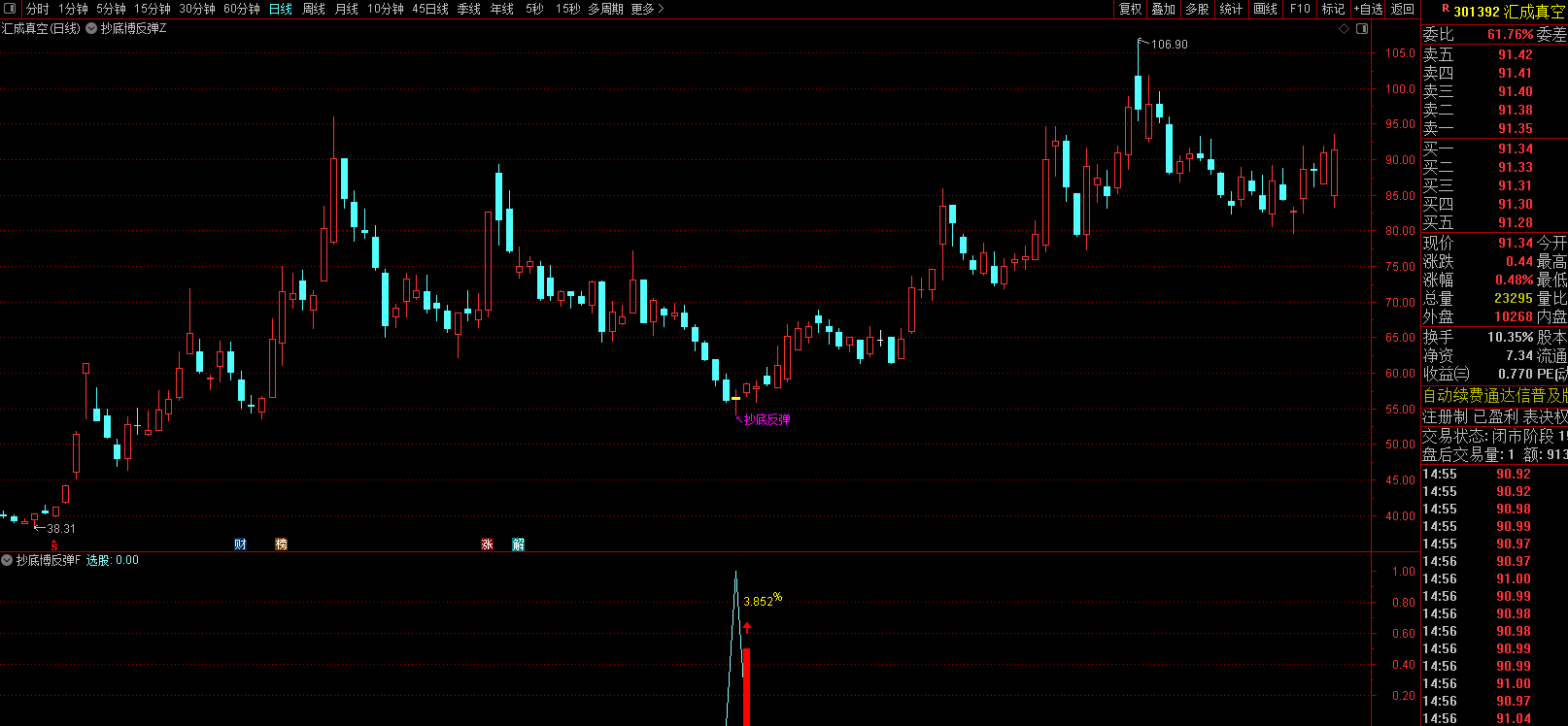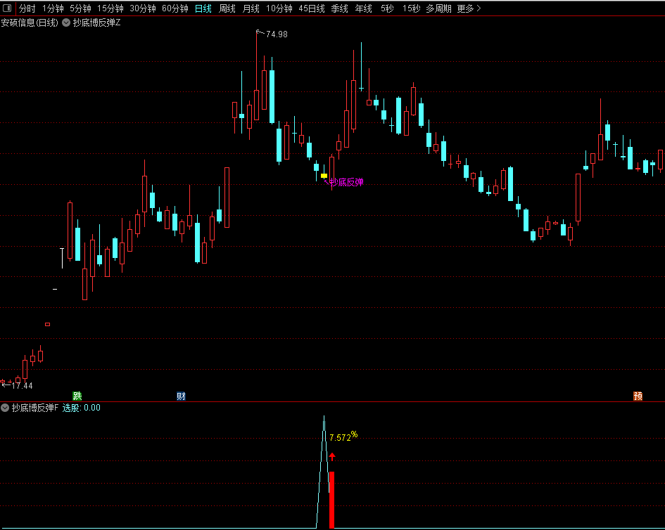 这套指标的信号基于抄底思路,通过27周期高低点动态计算价格相对位置,采用三重平滑处理,强化趋势转折信号的可靠性。旨在捕捉市场潜在的反弹机会,为投资者提供可能的一波上涨前的介入点。