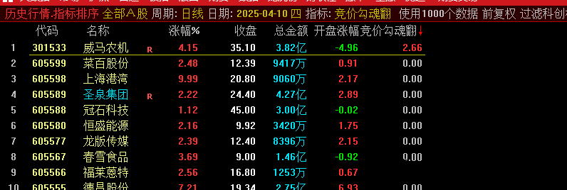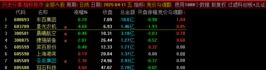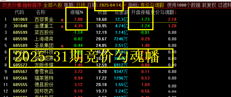 今天是4月14日,说下今天的战绩,此指标用于竞价排序,全天信号不变,可当日回测,今天出的两只,