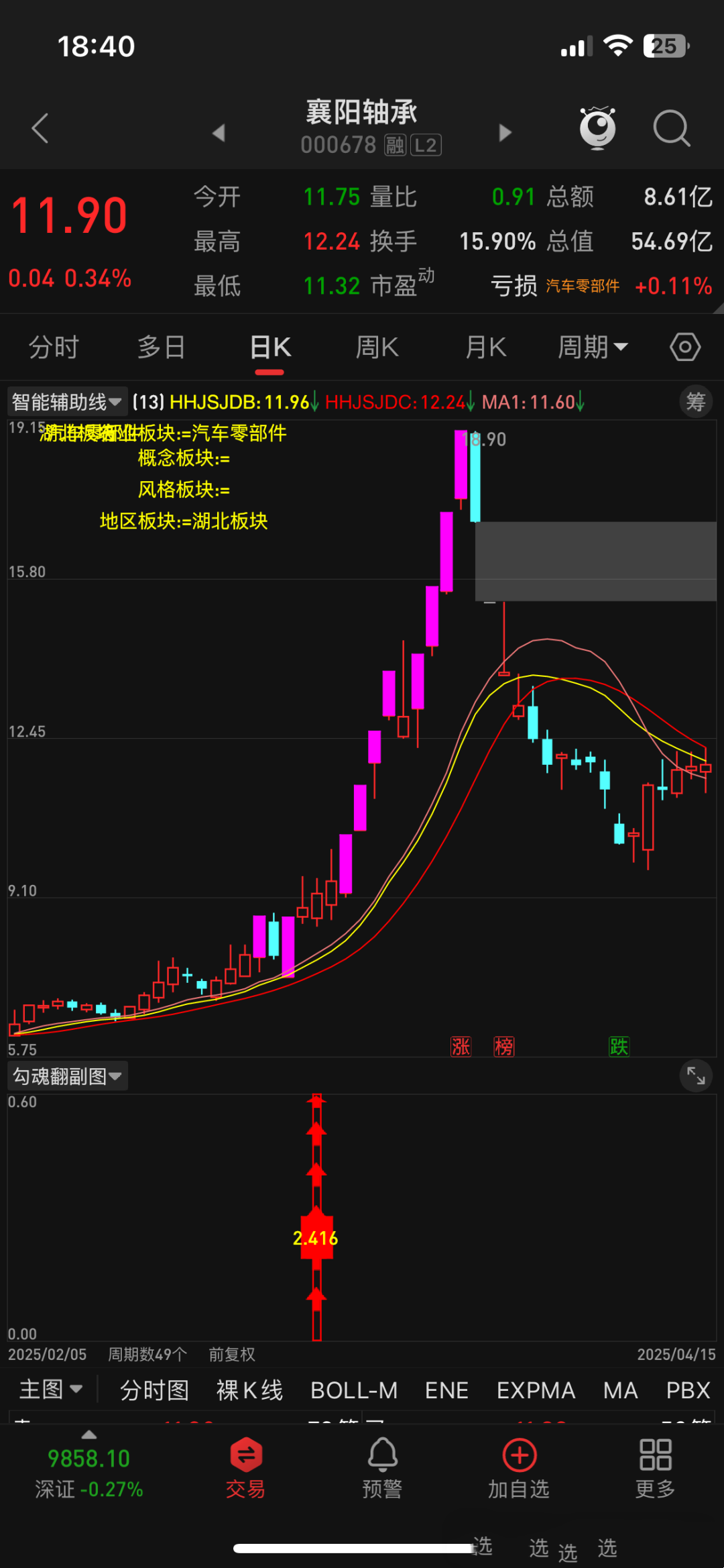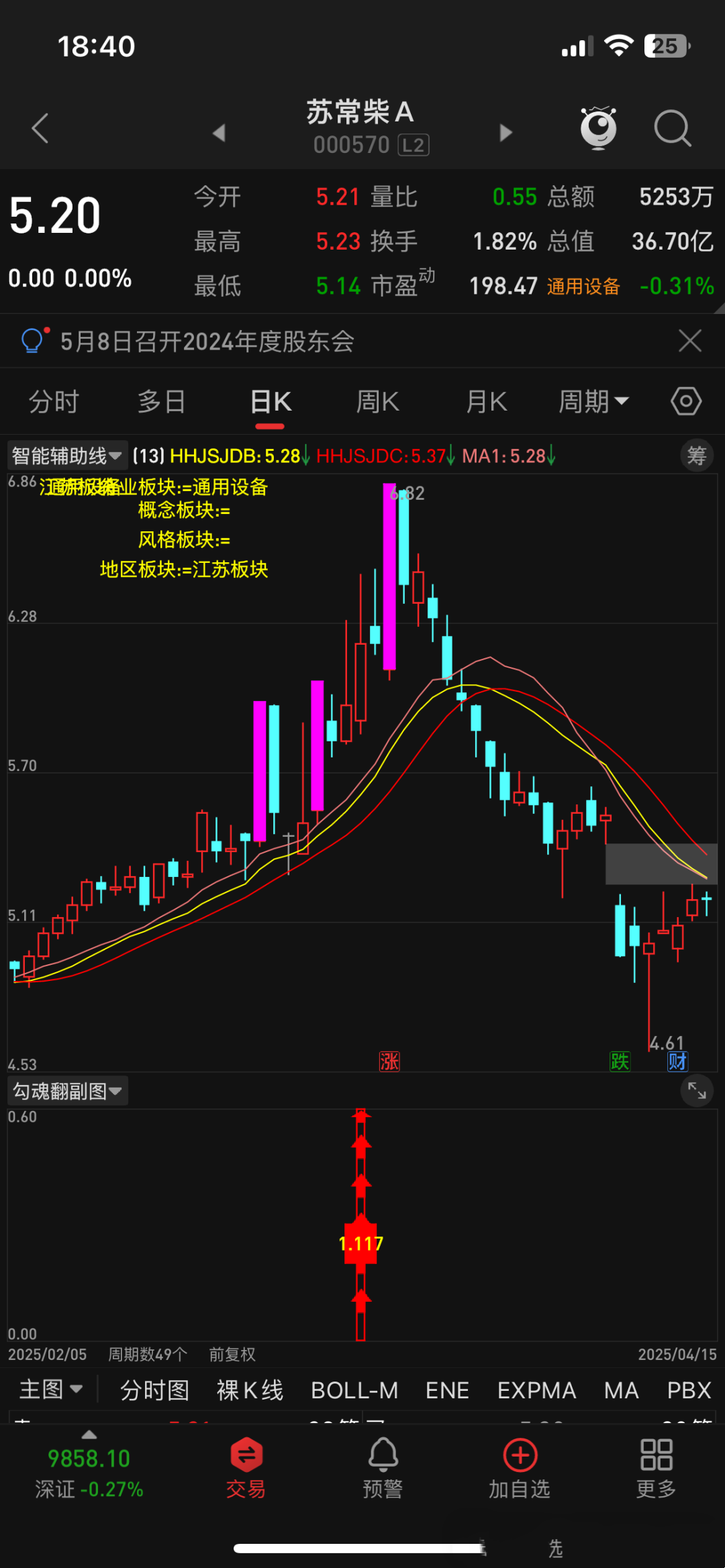 指标套装包含副图指标、排序指标和选股指标,本思路为短线低吸思路;手机端可以使用副图和选股,因为手机没有排序功能,所以排序指标没有用;电脑端三个都是可以同时使用的,但是建议电脑端使用副图和排序即可,电脑版需要下载专业财务数据才会显示幅图指标信号,或者使用副图和选股,也就是说,电脑端是排序、选股任选其一加上副图使用;我们看一下副图显示效果: