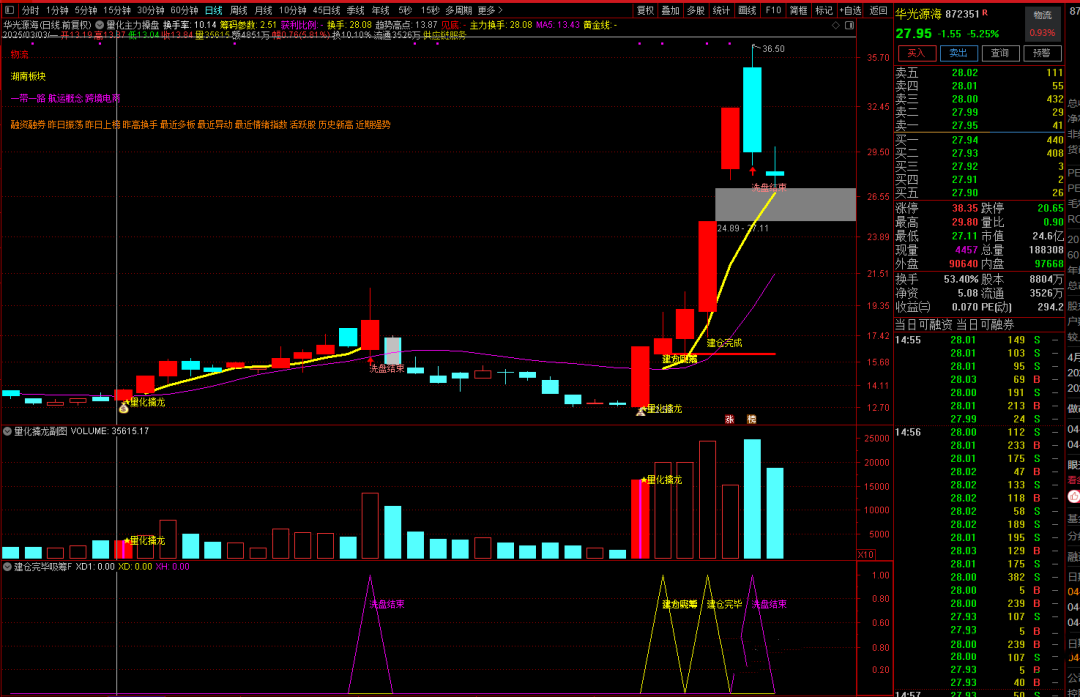 3、洗盘结束:是个股在先吸筹再建仓完毕,在拉升主升过程中的一个洗盘结束信号,代表主力继续拉升。