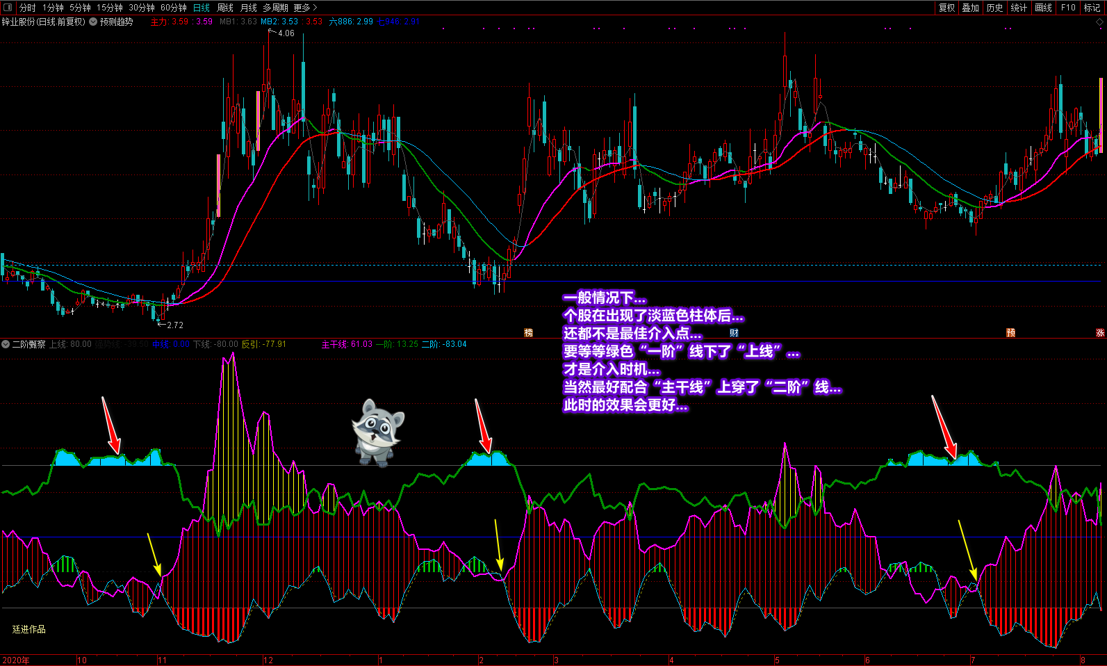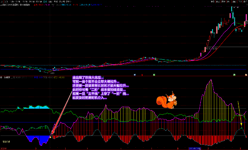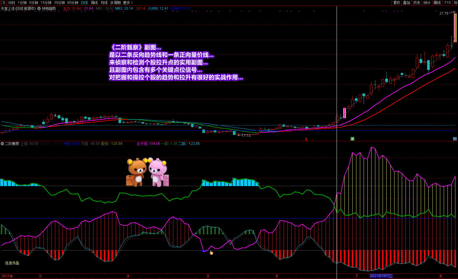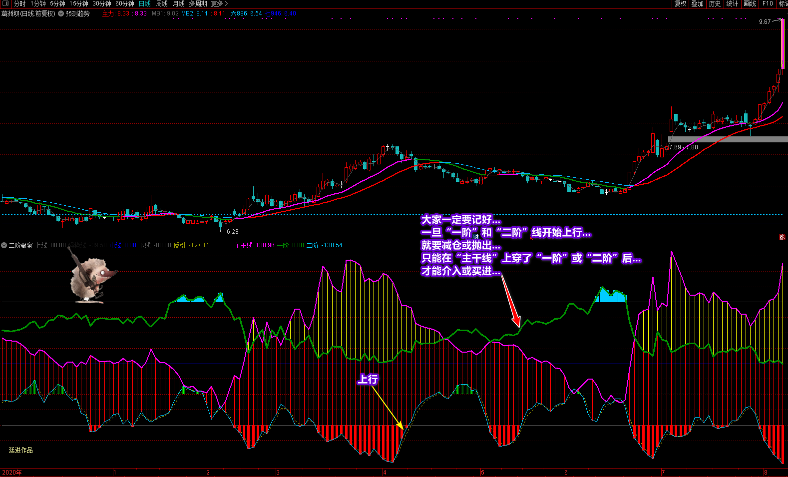 这次发表的《二阶甄察》副图指标,最大的突出点在于可以利用指标的多点信号及时把握个股的操作和进出,并利用颜色提示个股目前处在什么趋势,将来又如何去发展,什么时候可进,什么时候不该进,再配合附送的主图《预测趋势》,可以完美的对个股进行稳定操作。特别是副图中的多点信号和多点提示,对个股的操作是其它指标不可替代的。具体的操作说明和要领已经在截图中详细讲解过了,这里就不再赘述。